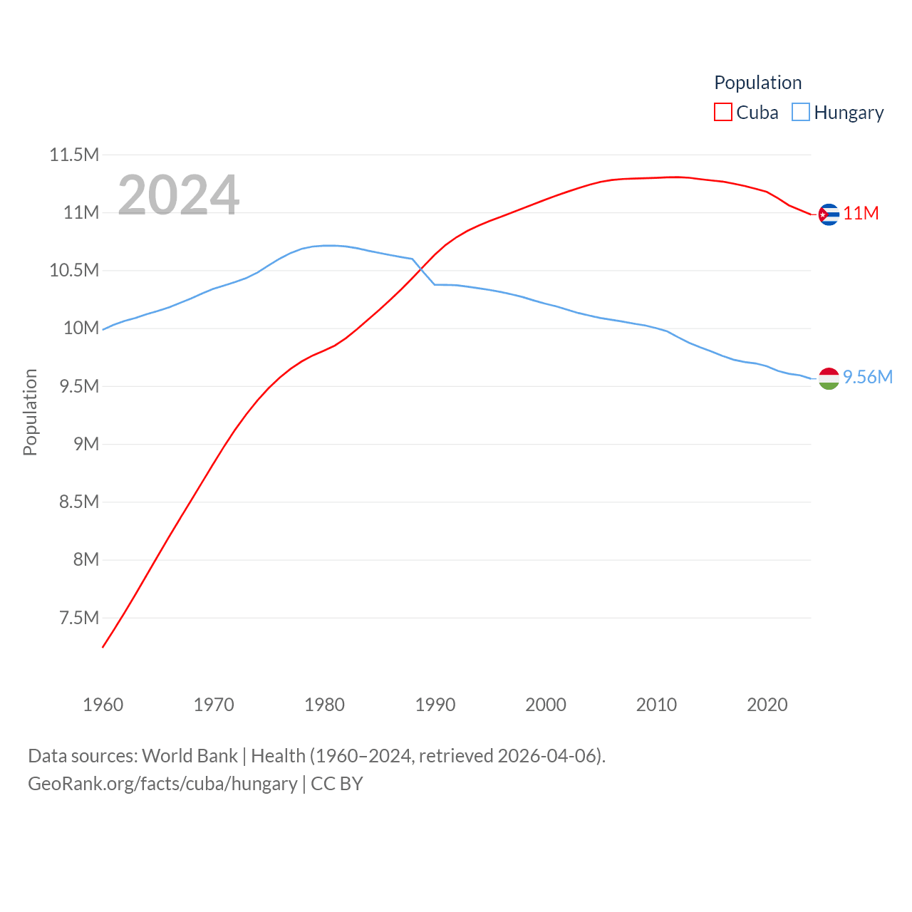 Cuba has a population of 11M (ranked 87/197), compared with 9.56M in Hungary (ranked 97/197). Cuba's land area is 40,077 sq mi versus 35,236 sq mi for Hungary (ranked 103rd vs. 109th).