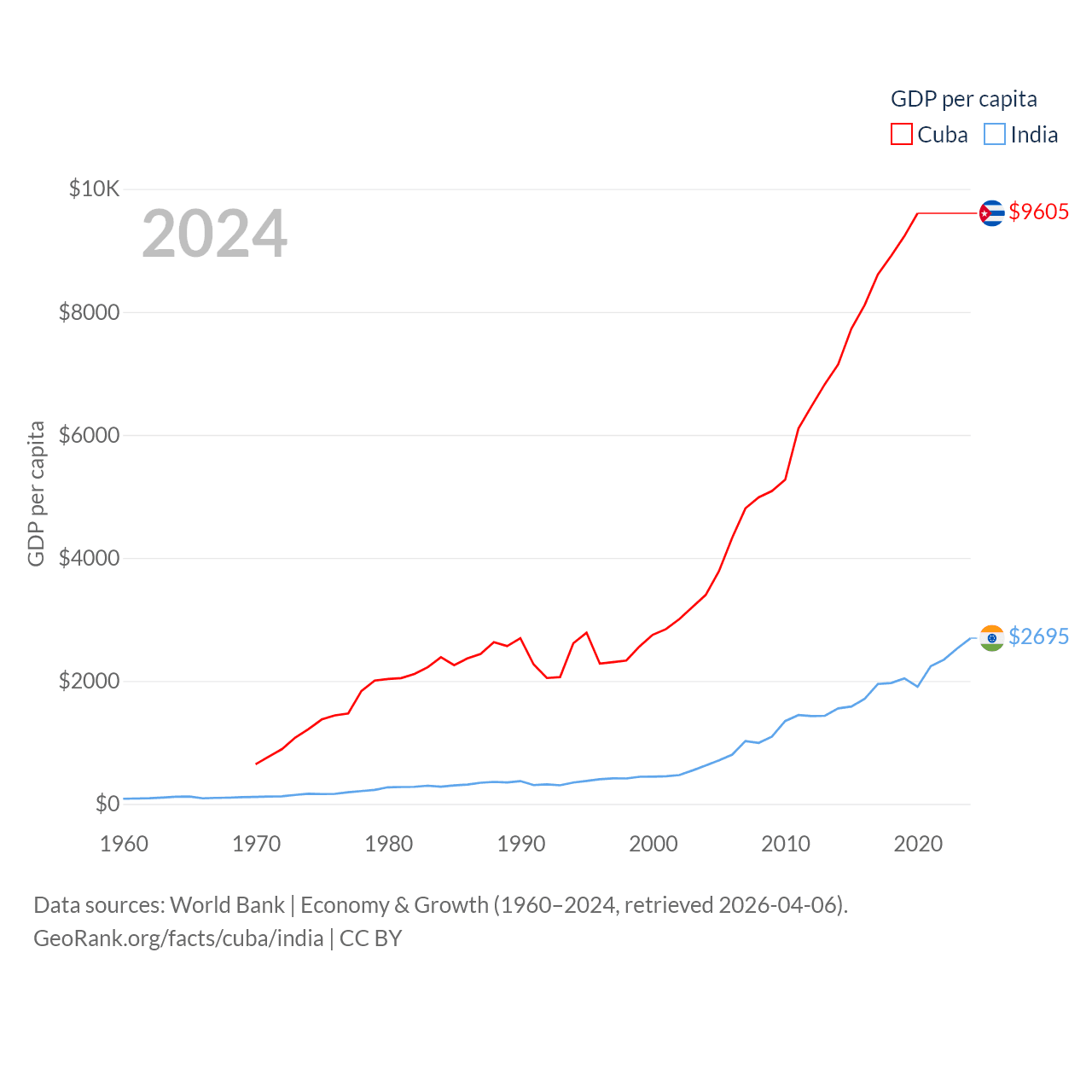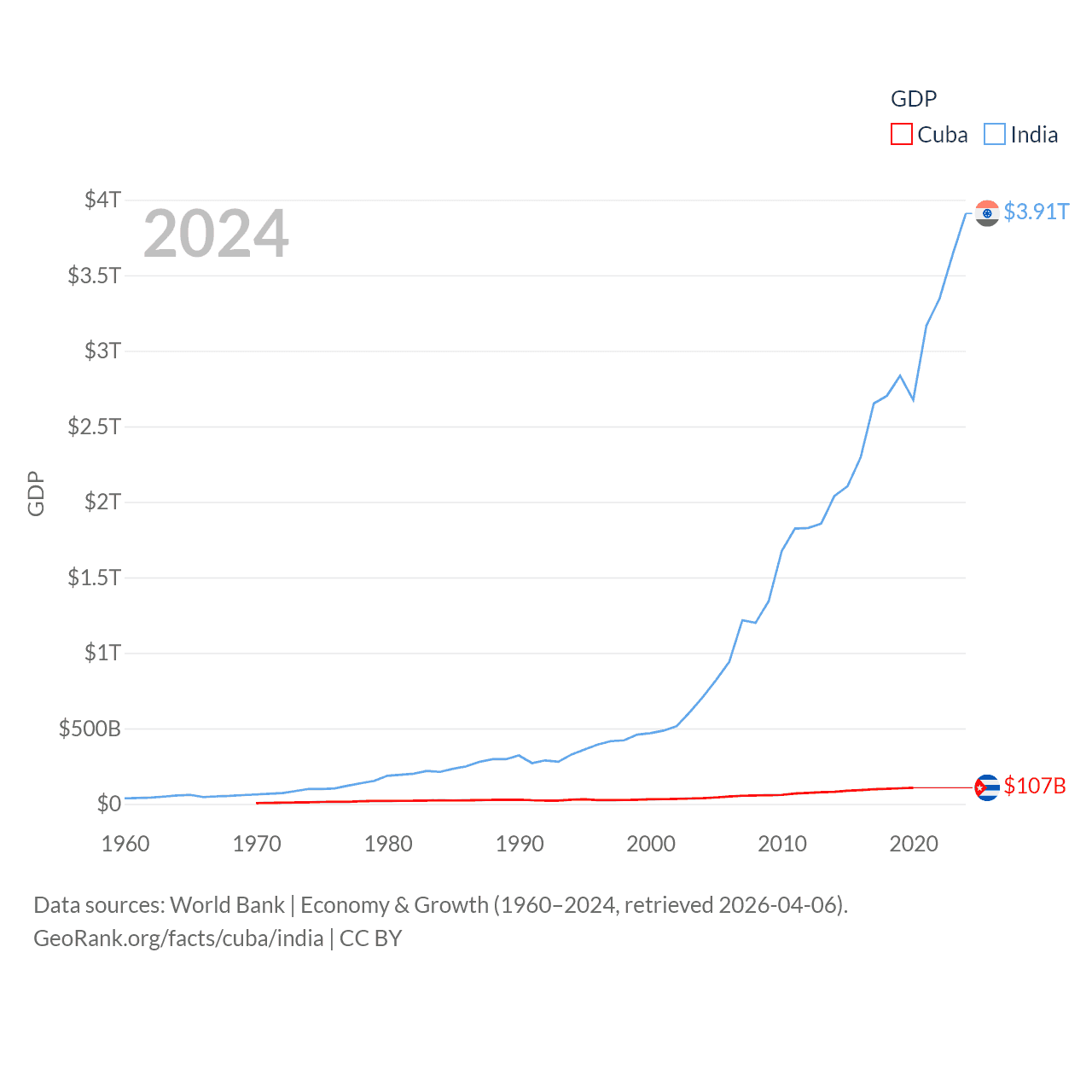 By GDP, Cuba ranks 69/197 ($107B) and India ranks 5/197 ($3.91T). By GDP per capita, Cuba ranks 86/197 ($9,605), while India ranks 143/197 ($2,695).