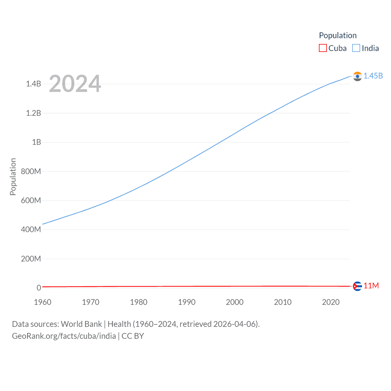Cuba has a population of 11M (ranked 87/197), compared with 1.45B in India (ranked 1/197). Cuba's land area is 40,077 sq mi versus 1,147,955 sq mi for India (ranked 103rd vs. 7th).