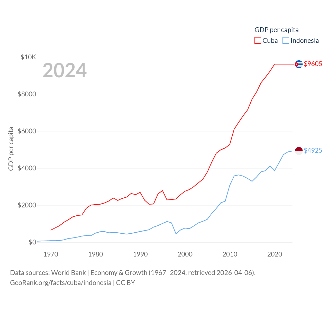 By GDP, Cuba ranks 69/197 ($107B) and Indonesia ranks 16/197 ($1.4T). By GDP per capita, Cuba ranks 86/197 ($9,605), while Indonesia ranks 121/197 ($4,925).