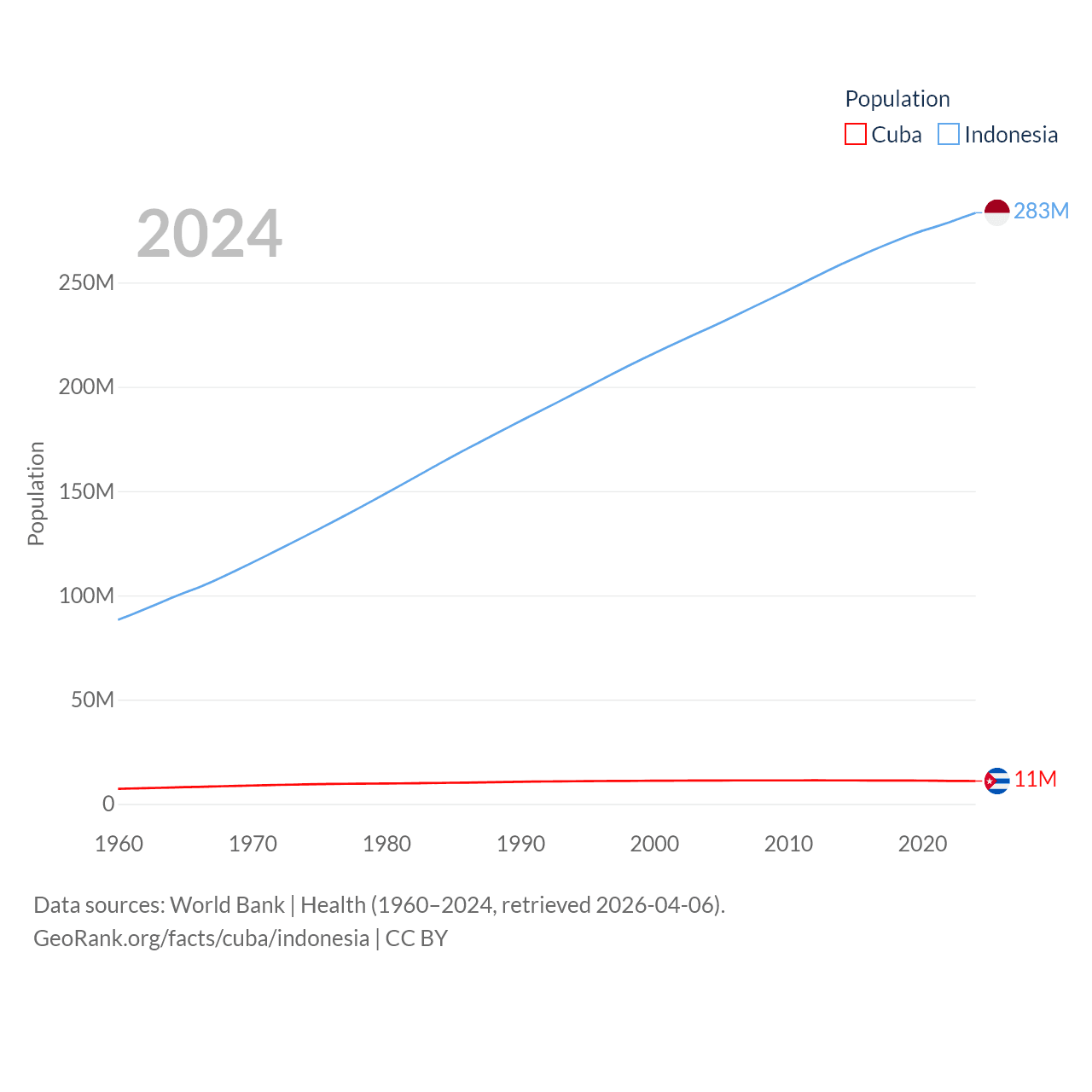 Cuba has a population of 11M (ranked 87/197), compared with 283M in Indonesia (ranked 4/197). Cuba's land area is 40,077 sq mi versus 730,720 sq mi for Indonesia (ranked 103rd vs. 14th).