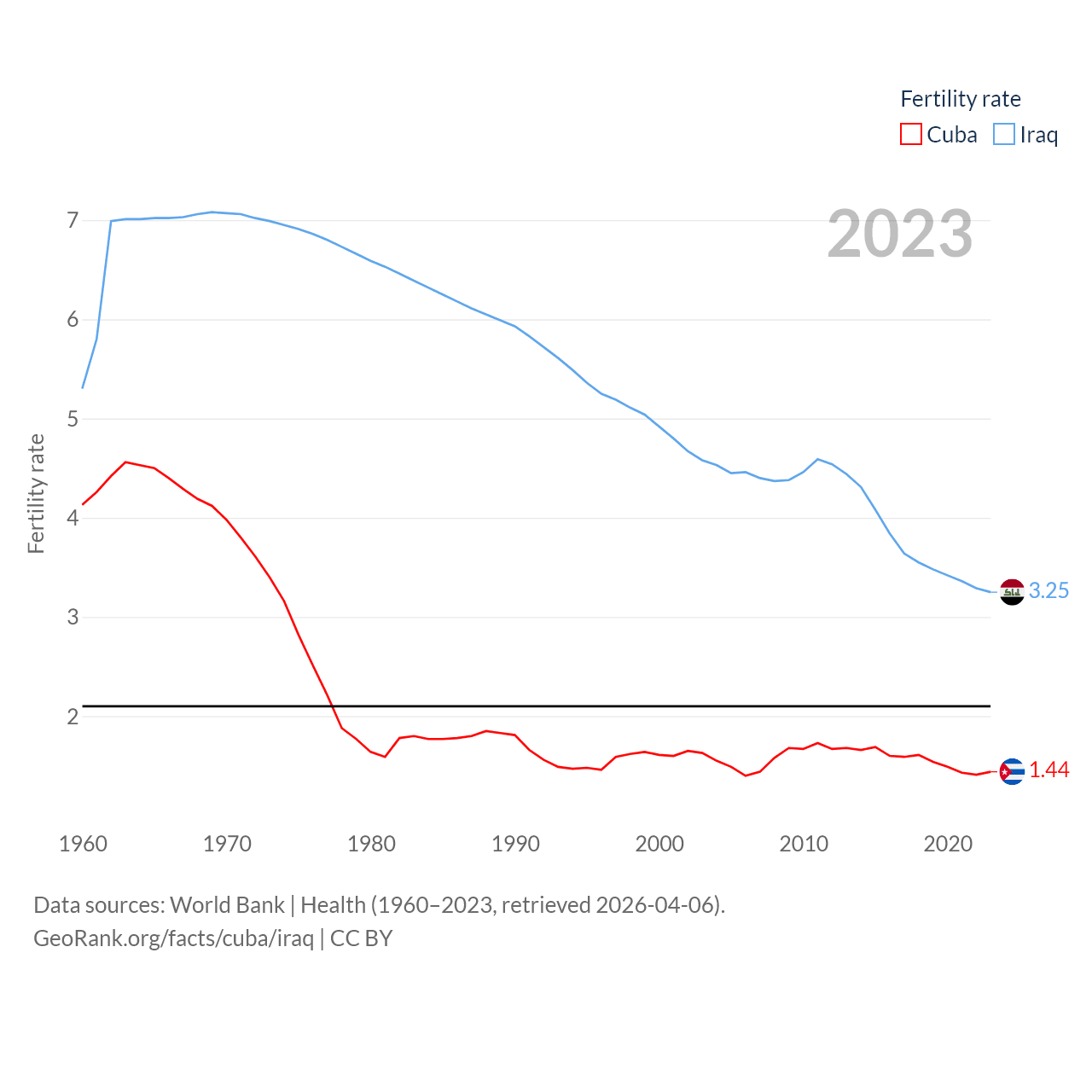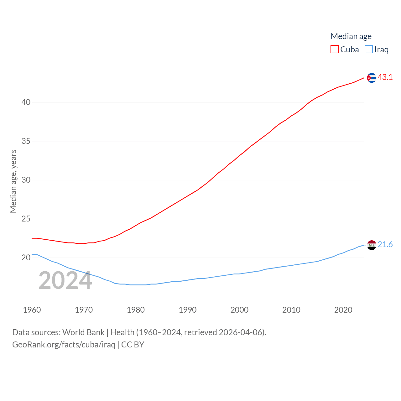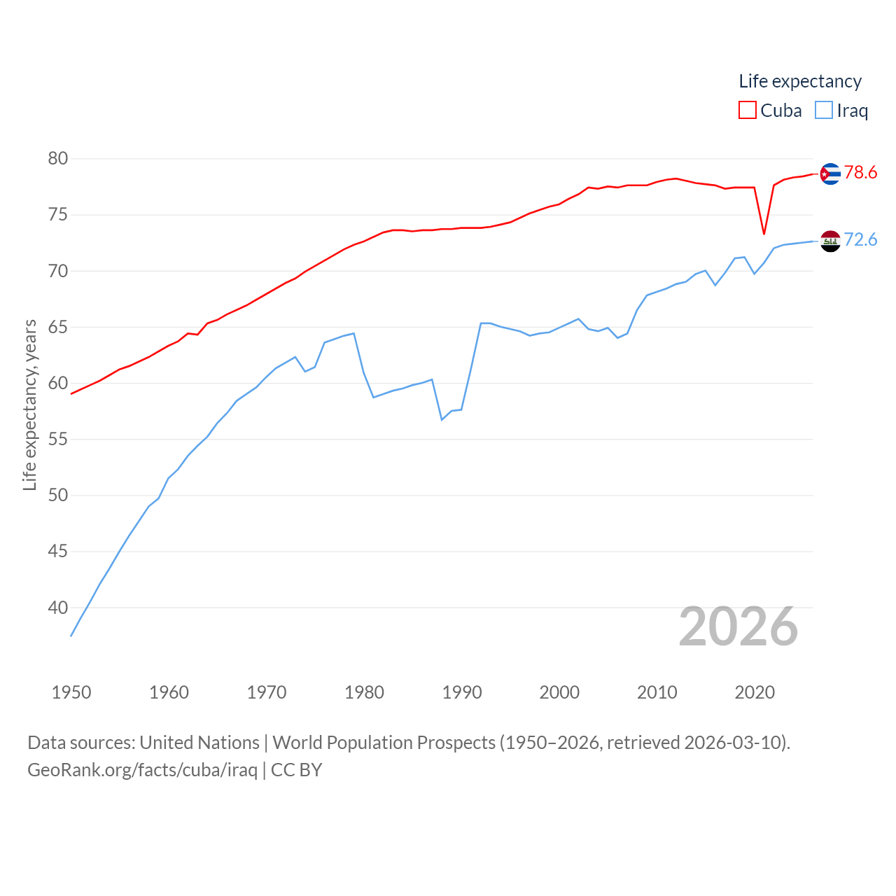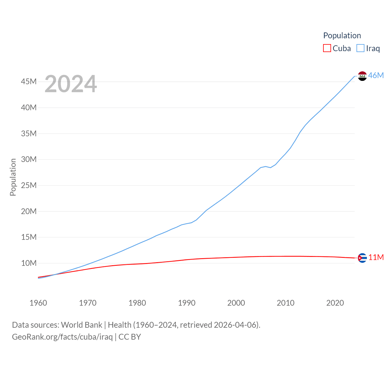 Cuba has a population of 11M (ranked 87/197), compared with 46M in Iraq (ranked 34/197). Cuba's land area is 40,077 sq mi versus 167,619 sq mi for Iraq (ranked 103rd vs. 57th).