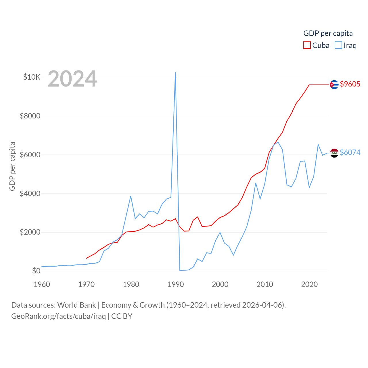 By GDP, Cuba ranks 69/197 ($107B) and Iraq ranks 50/197 ($280B). By GDP per capita, Cuba ranks 86/197 ($9,605), while Iraq ranks 113/197 ($6,074).