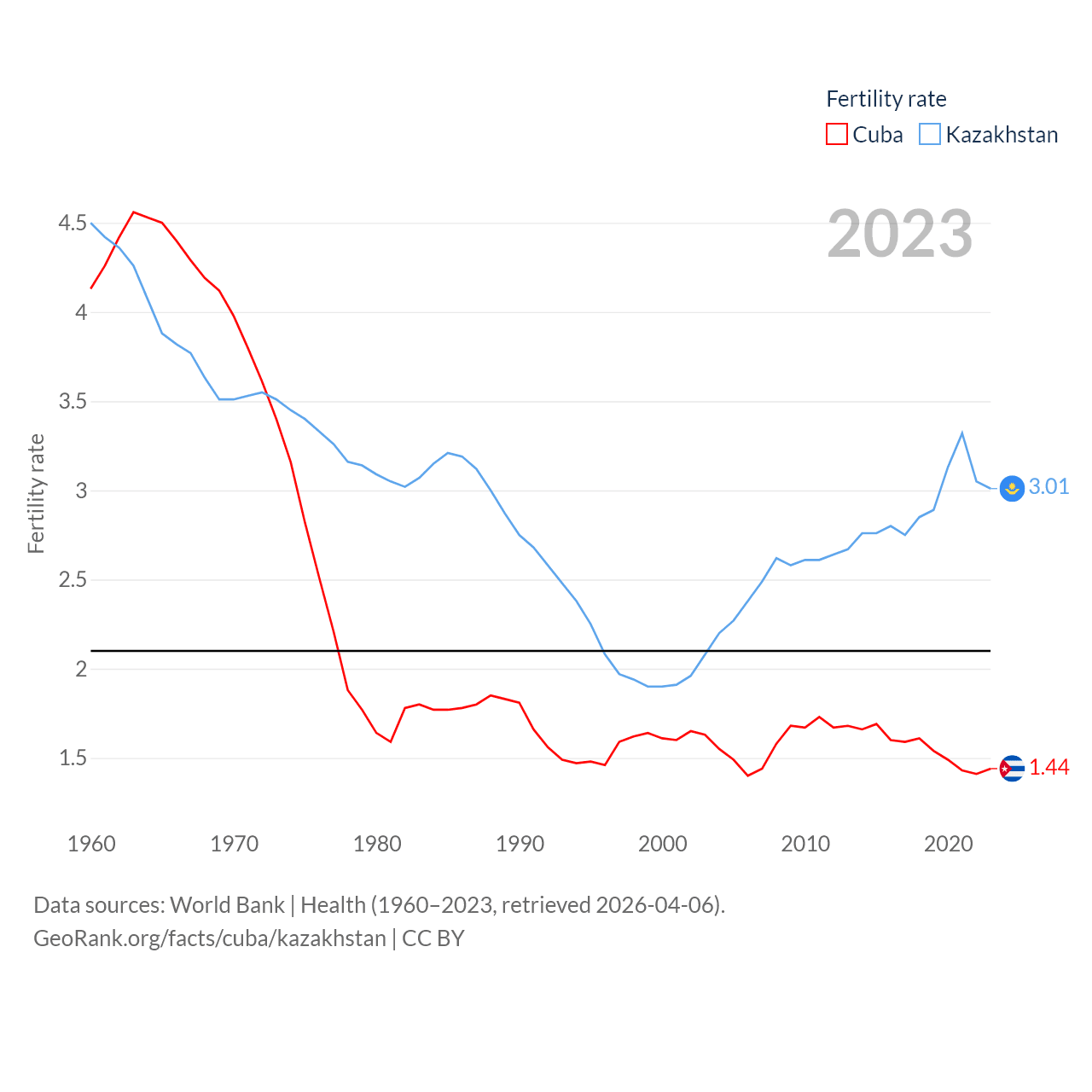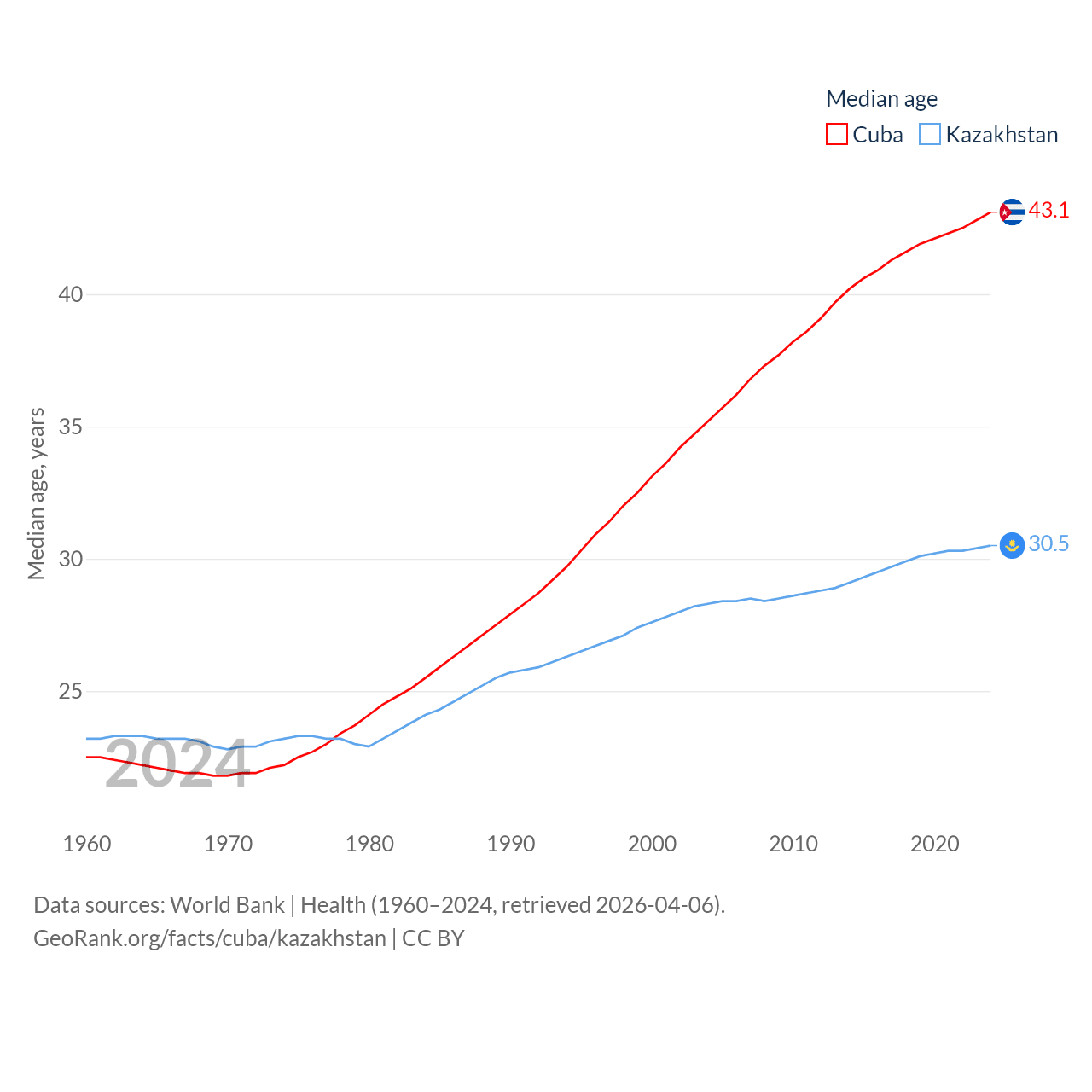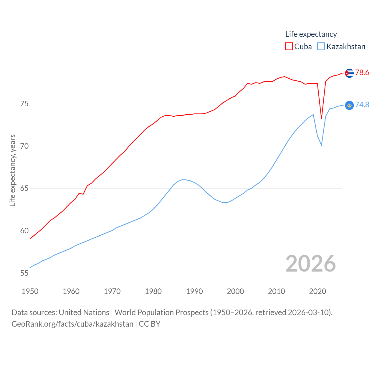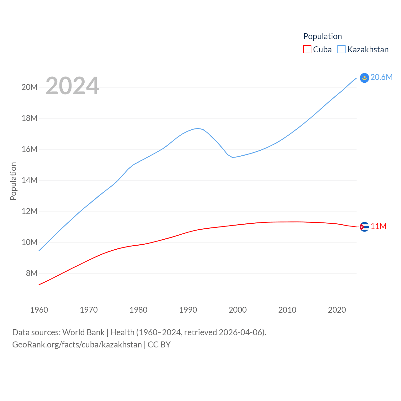 Cuba has a population of 11M (ranked 87/197), compared with 20.6M in Kazakhstan (ranked 64/197). Cuba's land area is 40,077 sq mi versus 1,042,360 sq mi for Kazakhstan (ranked 103rd vs. 9th).