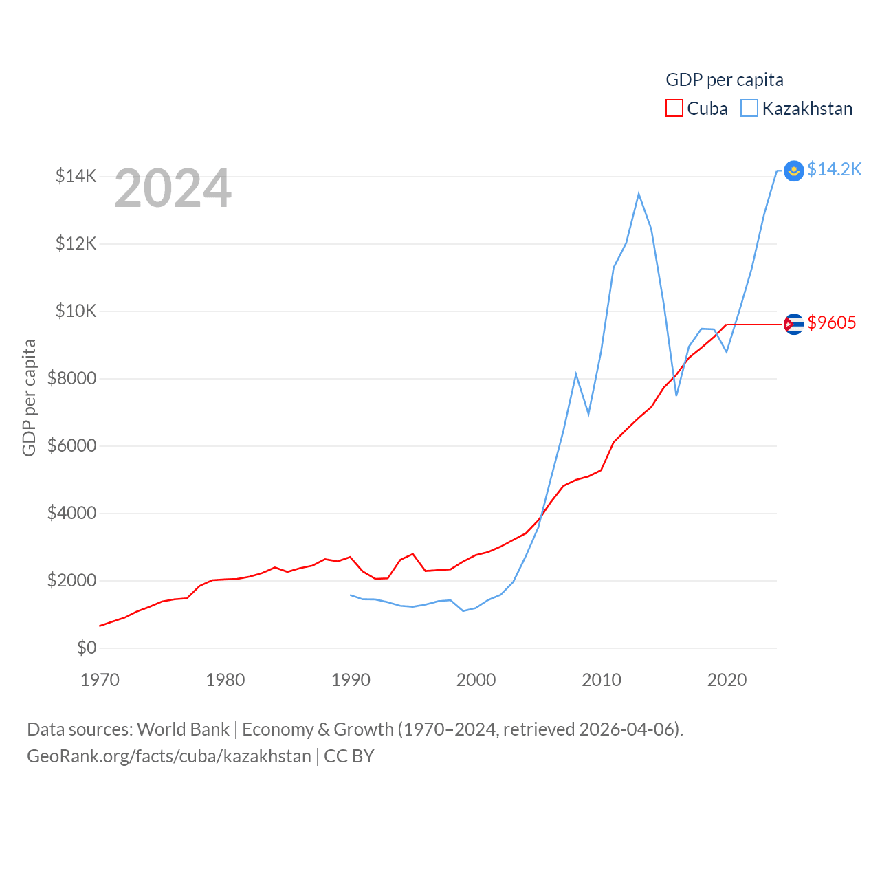 By GDP, Cuba ranks 69/197 ($107B) and Kazakhstan ranks 48/197 ($291B). By GDP per capita, Cuba ranks 86/197 ($9,605), while Kazakhstan ranks 71/197 ($14,155).