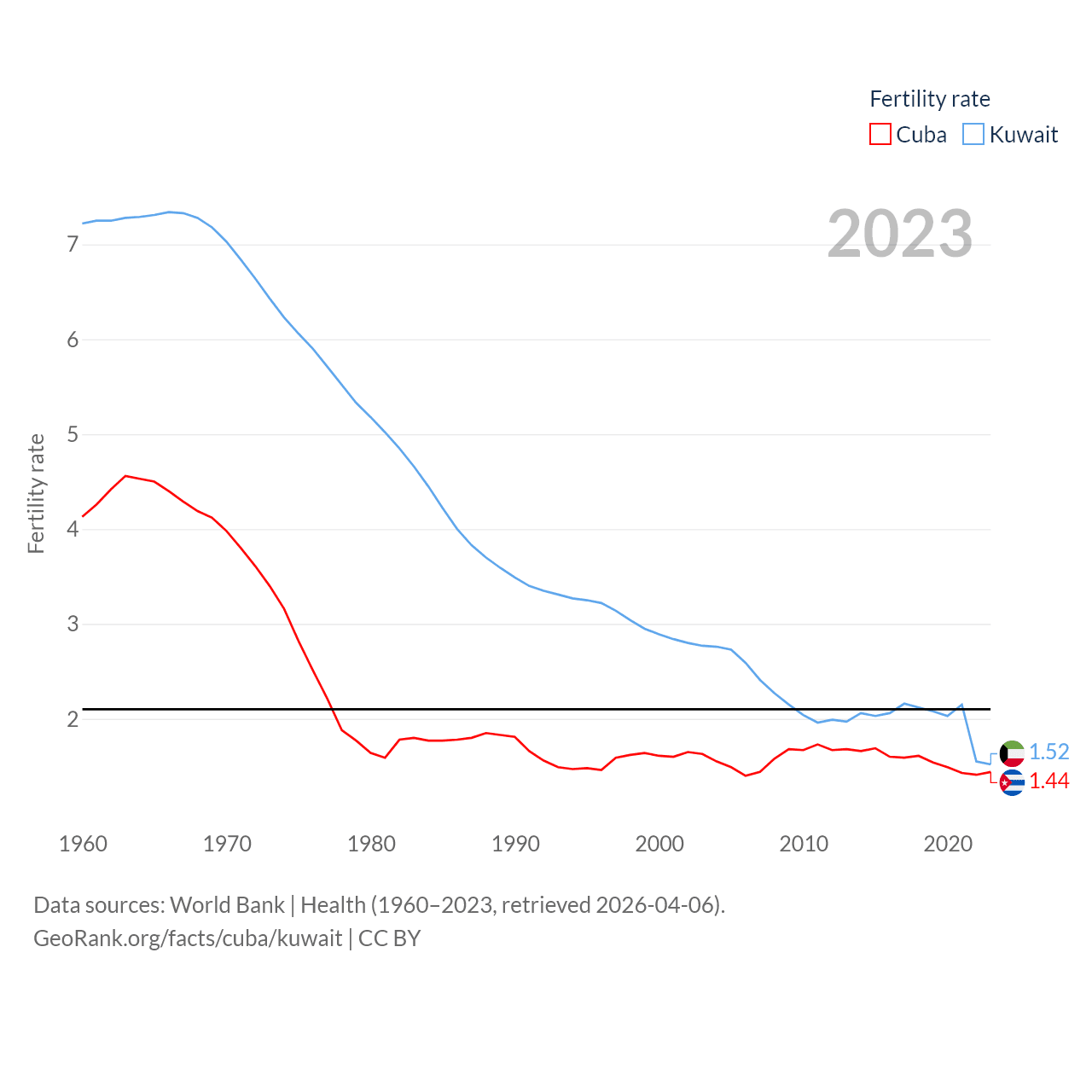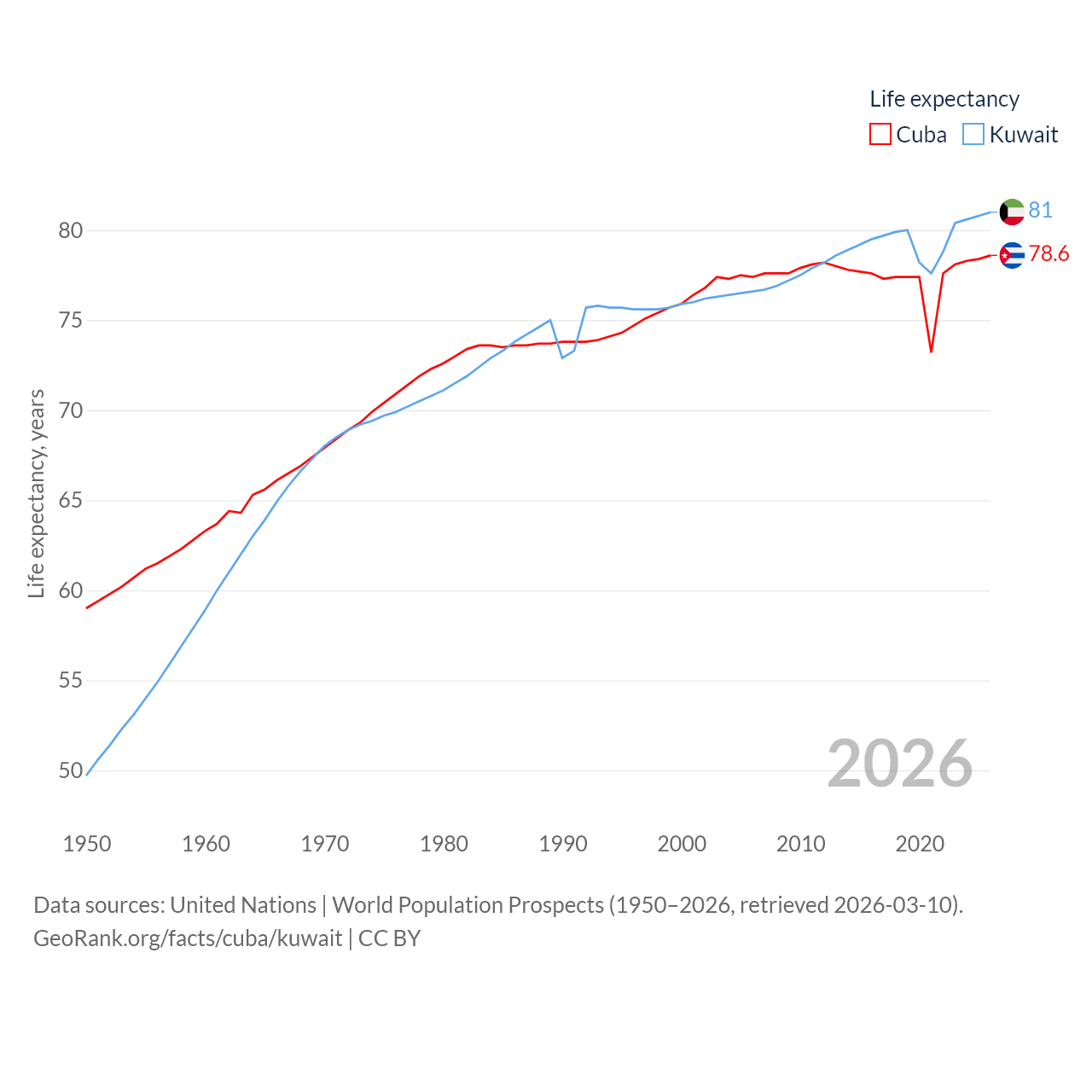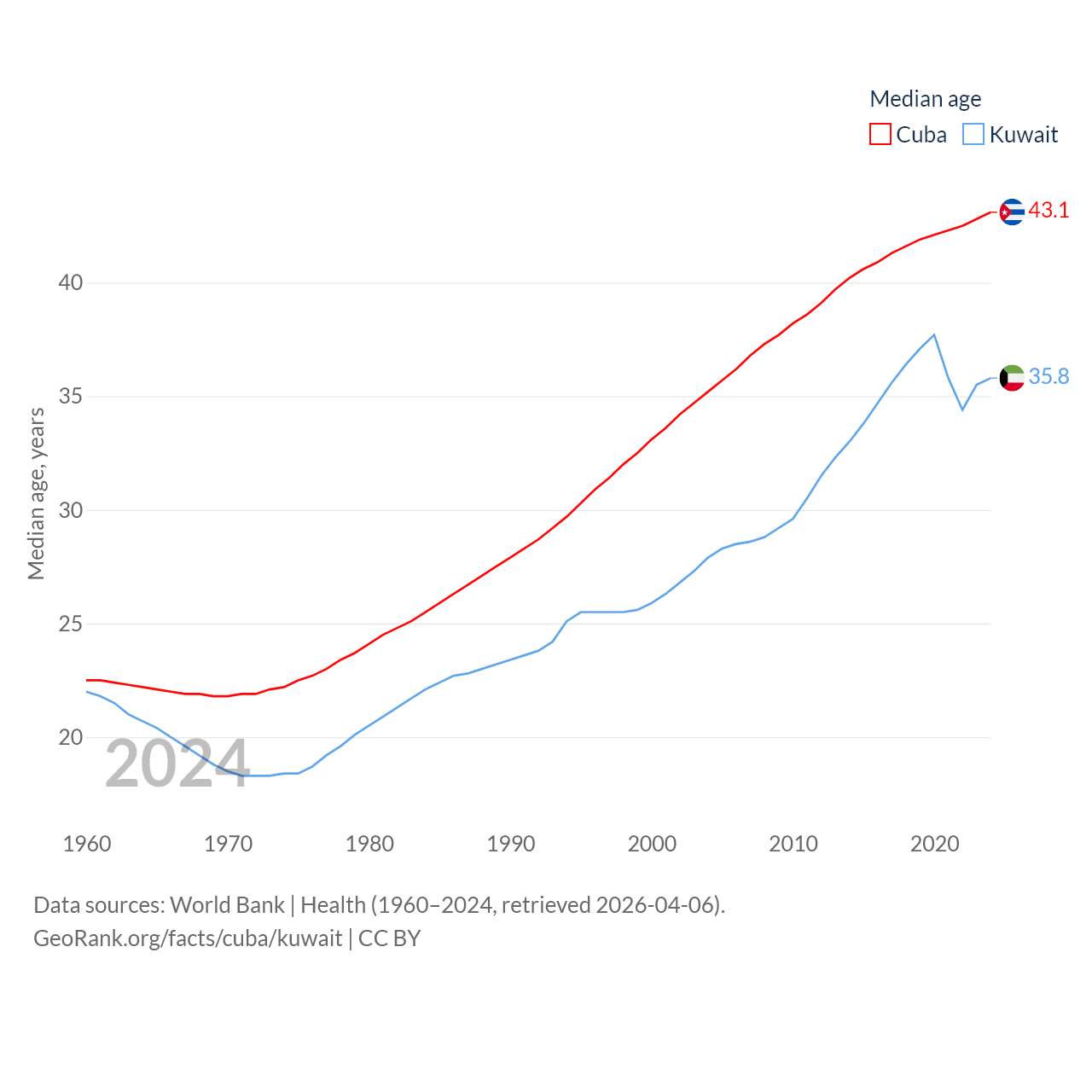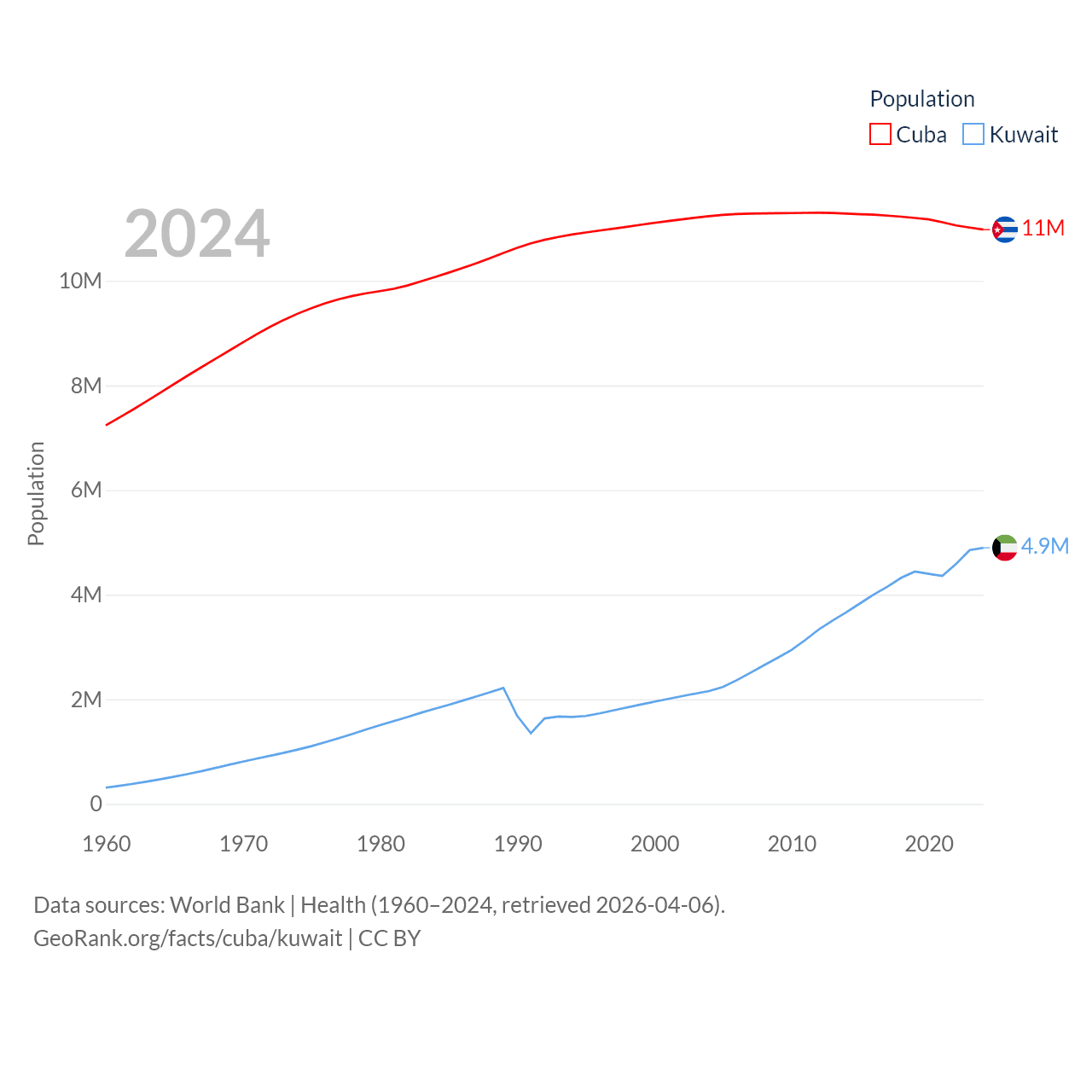 Cuba has a population of 11M (ranked 87/197), compared with 4.9M in Kuwait (ranked 127/197). Cuba's land area is 40,077 sq mi versus 6,880 sq mi for Kuwait (ranked 103rd vs. 153rd).