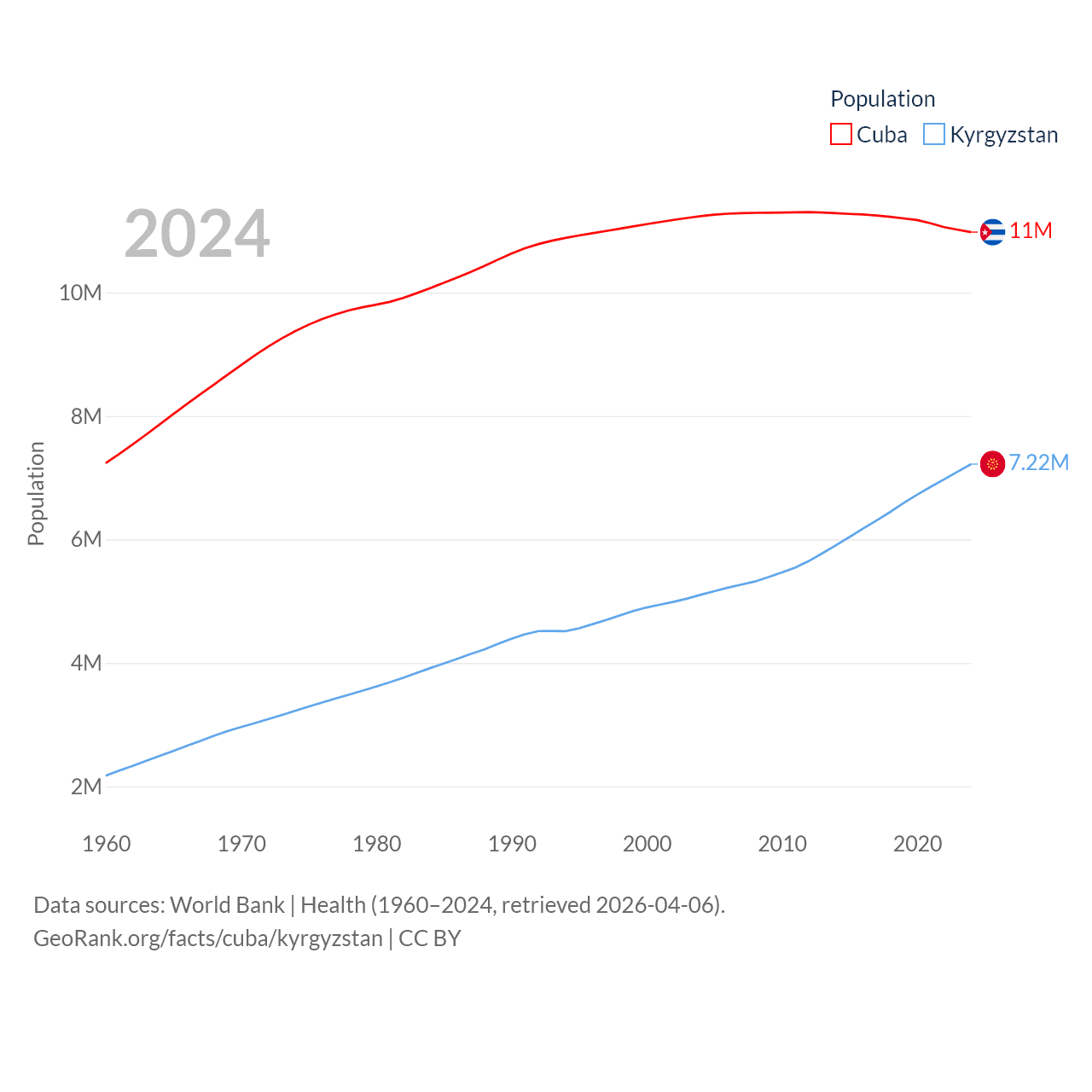 Cuba has a population of 11M (ranked 87/197), compared with 7.22M in Kyrgyzstan (ranked 106/197). Cuba's land area is 40,077 sq mi versus 74,054 sq mi for Kyrgyzstan (ranked 103rd vs. 86th).