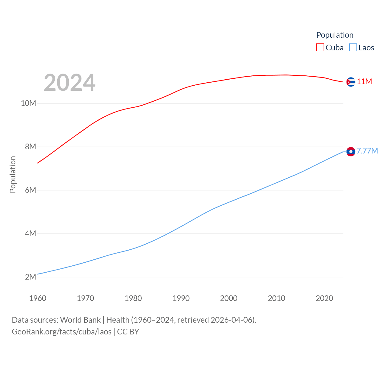 Cuba has a population of 11M (ranked 87/197), compared with 7.77M in Laos (ranked 103/197). Cuba's land area is 40,077 sq mi versus 89,112 sq mi for Laos (ranked 103rd vs. 79th).