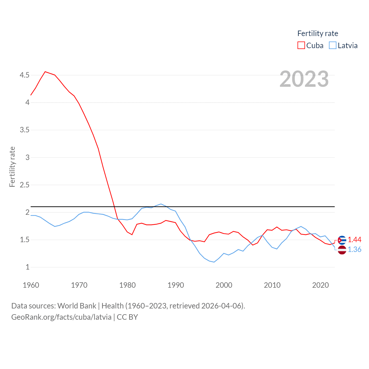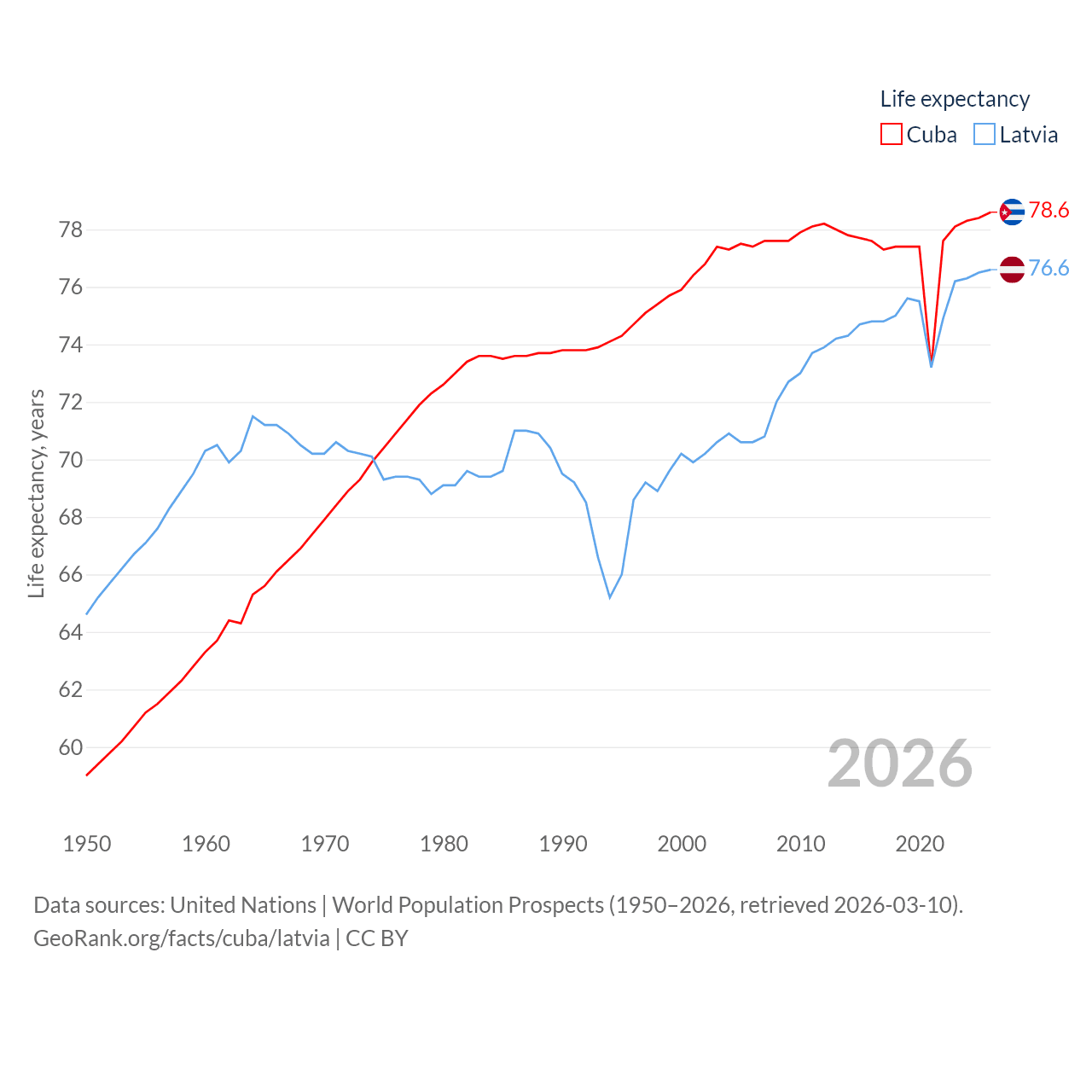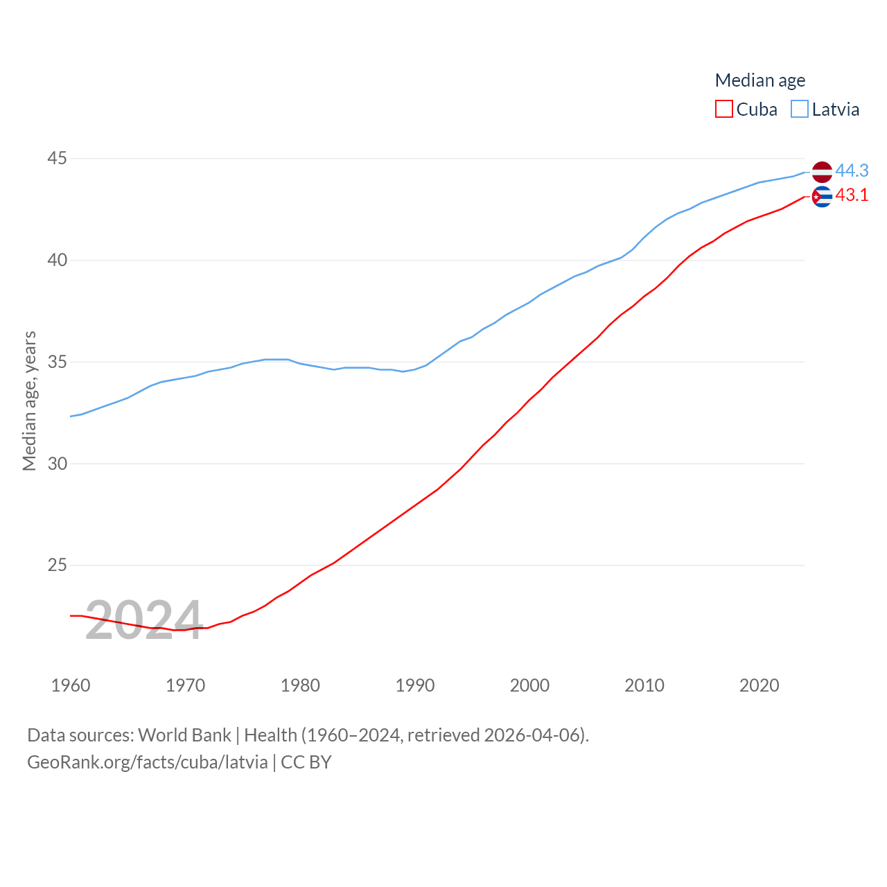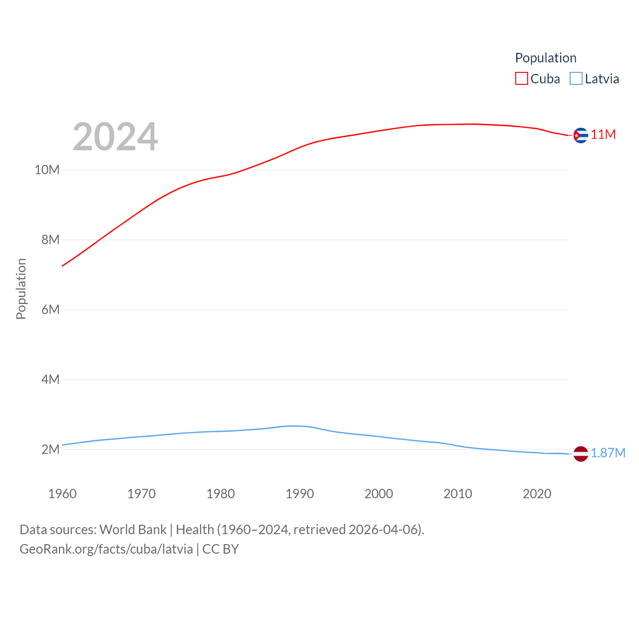 Cuba has a population of 11M (ranked 87/197), compared with 1.87M in Latvia (ranked 149/197). Cuba's land area is 40,077 sq mi versus 24,027 sq mi for Latvia (ranked 103rd vs. 121st).