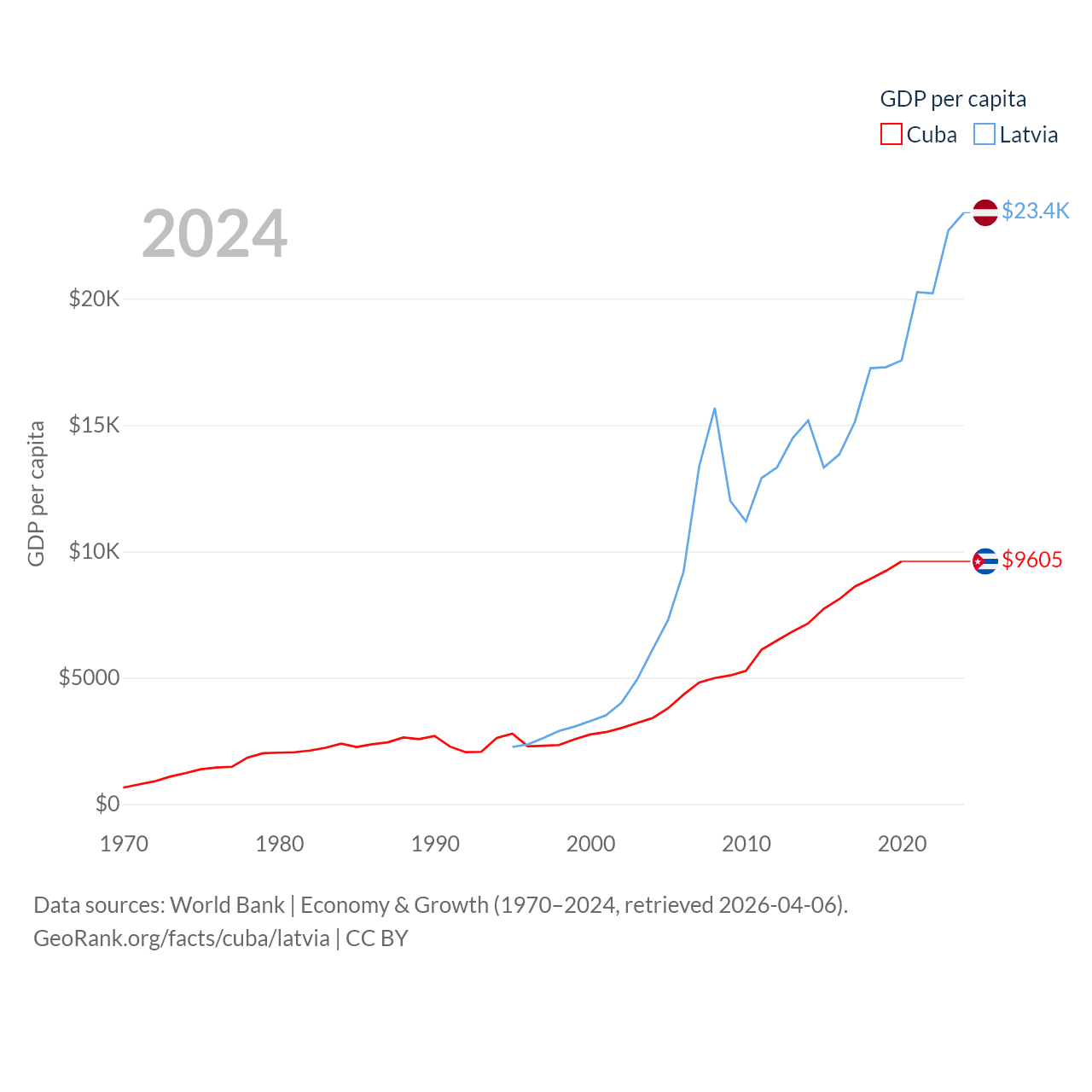 By GDP, Cuba ranks 69/197 ($107B) and Latvia ranks 99/197 ($43.7B). By GDP per capita, Cuba ranks 86/197 ($9,605), while Latvia ranks 54/197 ($23,409).