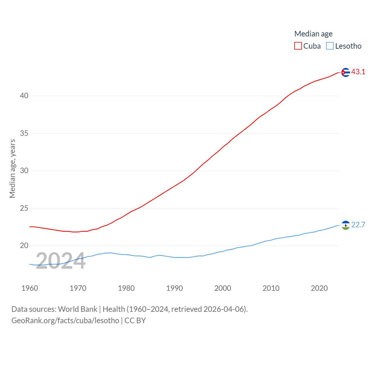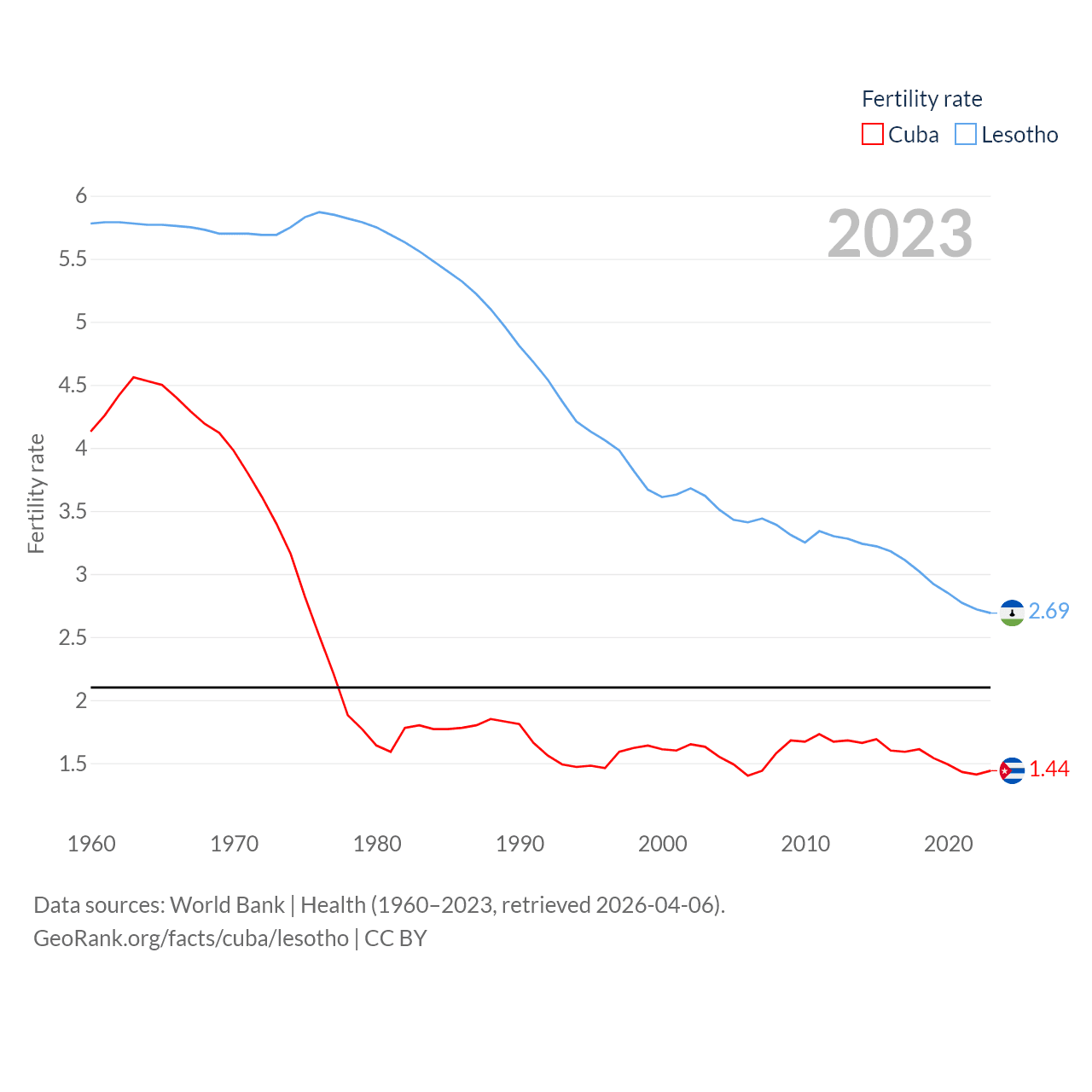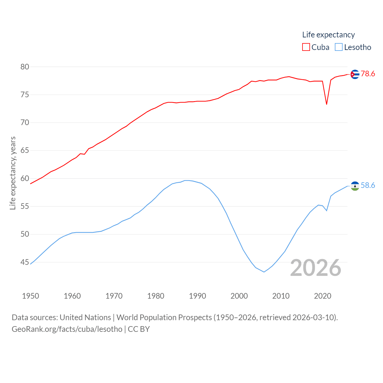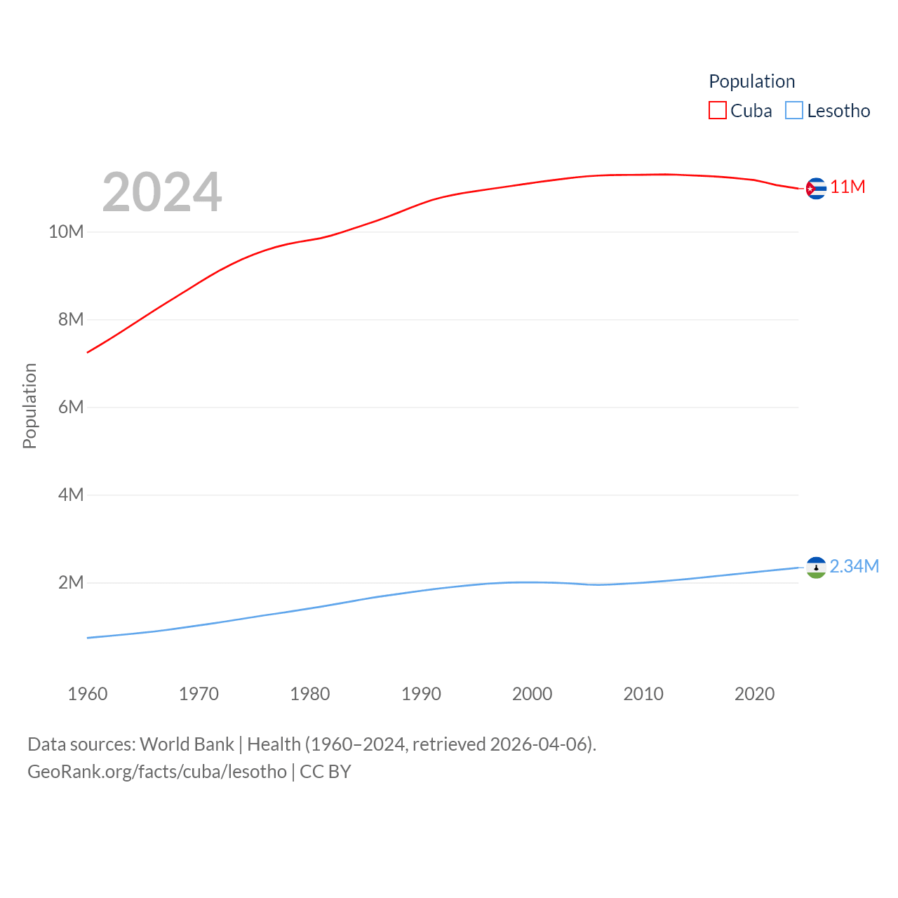 Cuba has a population of 11M (ranked 87/197), compared with 2.34M in Lesotho (ranked 145/197). Cuba's land area is 40,077 sq mi versus 11,722 sq mi for Lesotho (ranked 103rd vs. 137th).