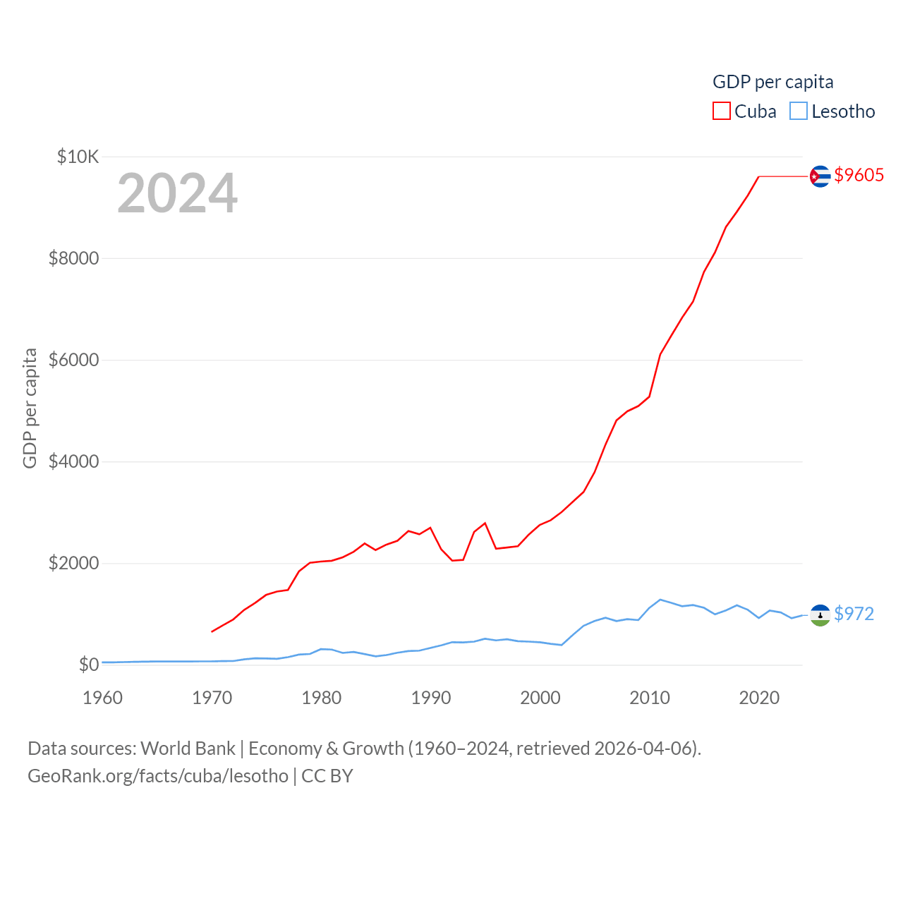 By GDP, Cuba ranks 69/197 ($107B) and Lesotho ranks 175/197 ($2.27B). By GDP per capita, Cuba ranks 86/197 ($9,605), while Lesotho ranks 181/197 ($972).