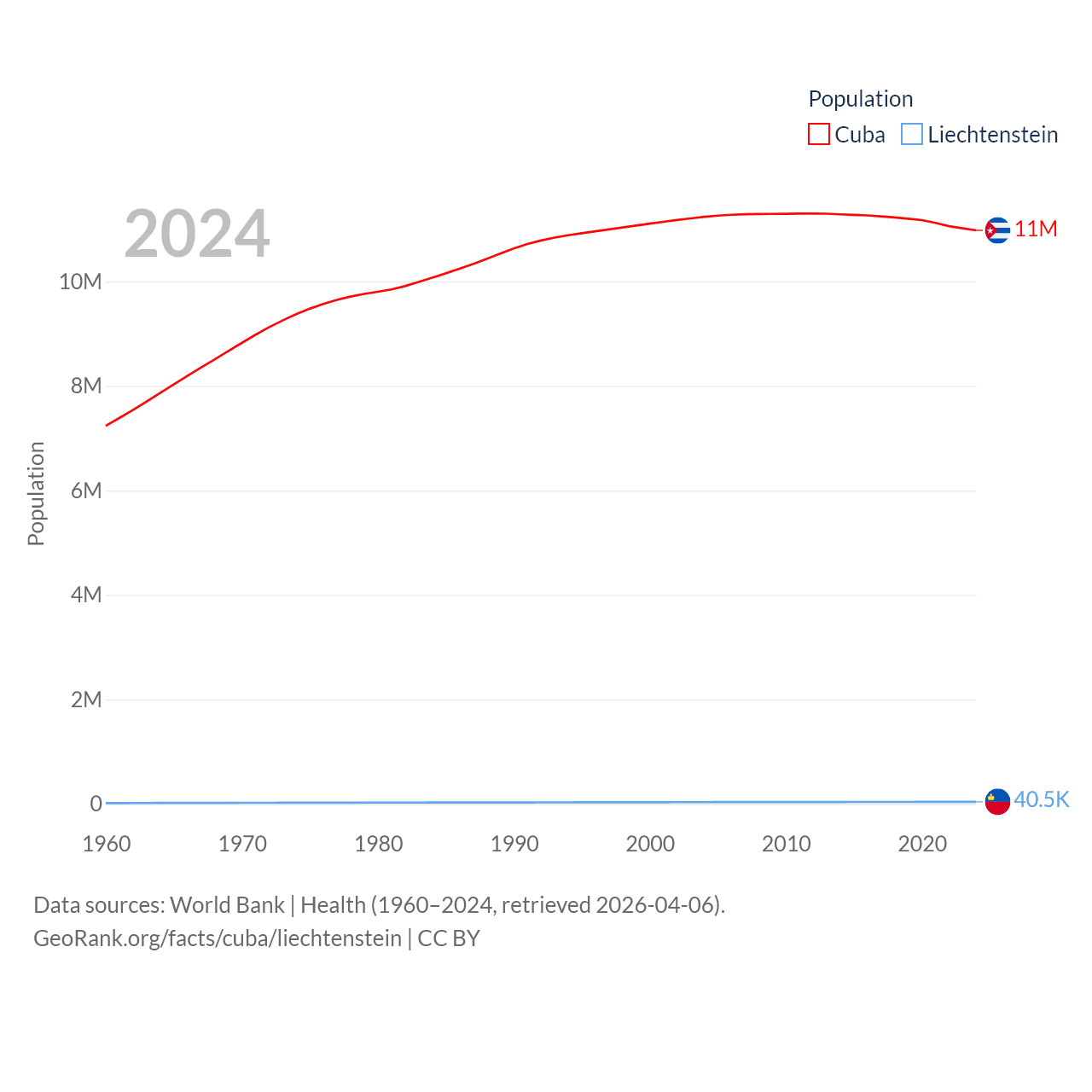 Cuba has a population of 11M (ranked 87/197), compared with 40.4K in Liechtenstein (ranked 190/197). Cuba's land area is 40,077 sq mi versus 61.8 sq mi for Liechtenstein (ranked 103rd vs. 192nd).
