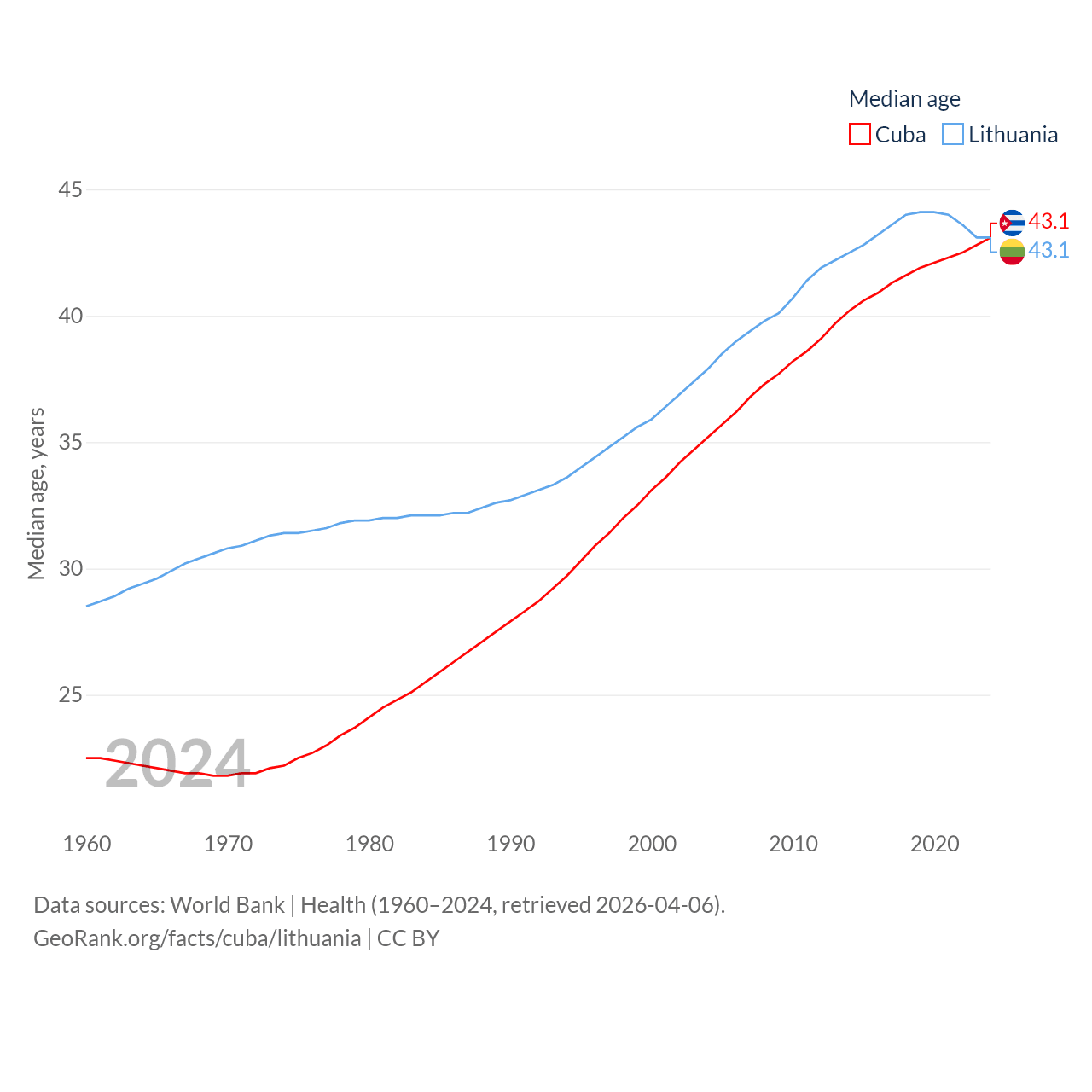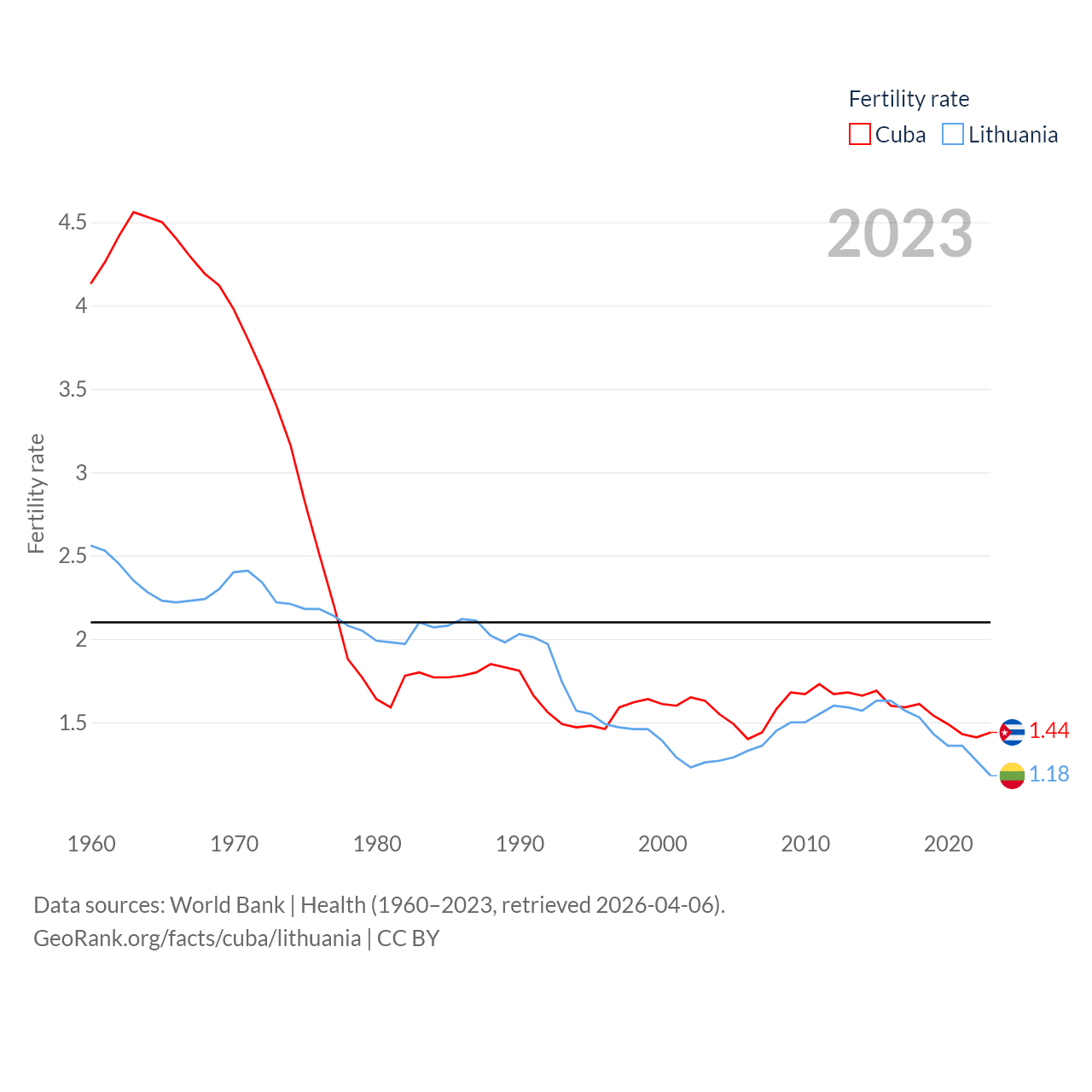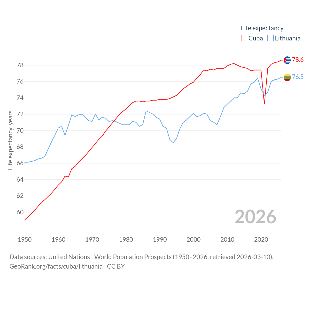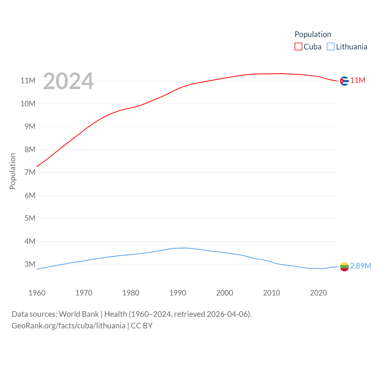 Cuba has a population of 11M (ranked 87/197), compared with 2.89M in Lithuania (ranked 137/197). Cuba's land area is 40,077 sq mi versus 24,170 sq mi for Lithuania (ranked 103rd vs. 120th).