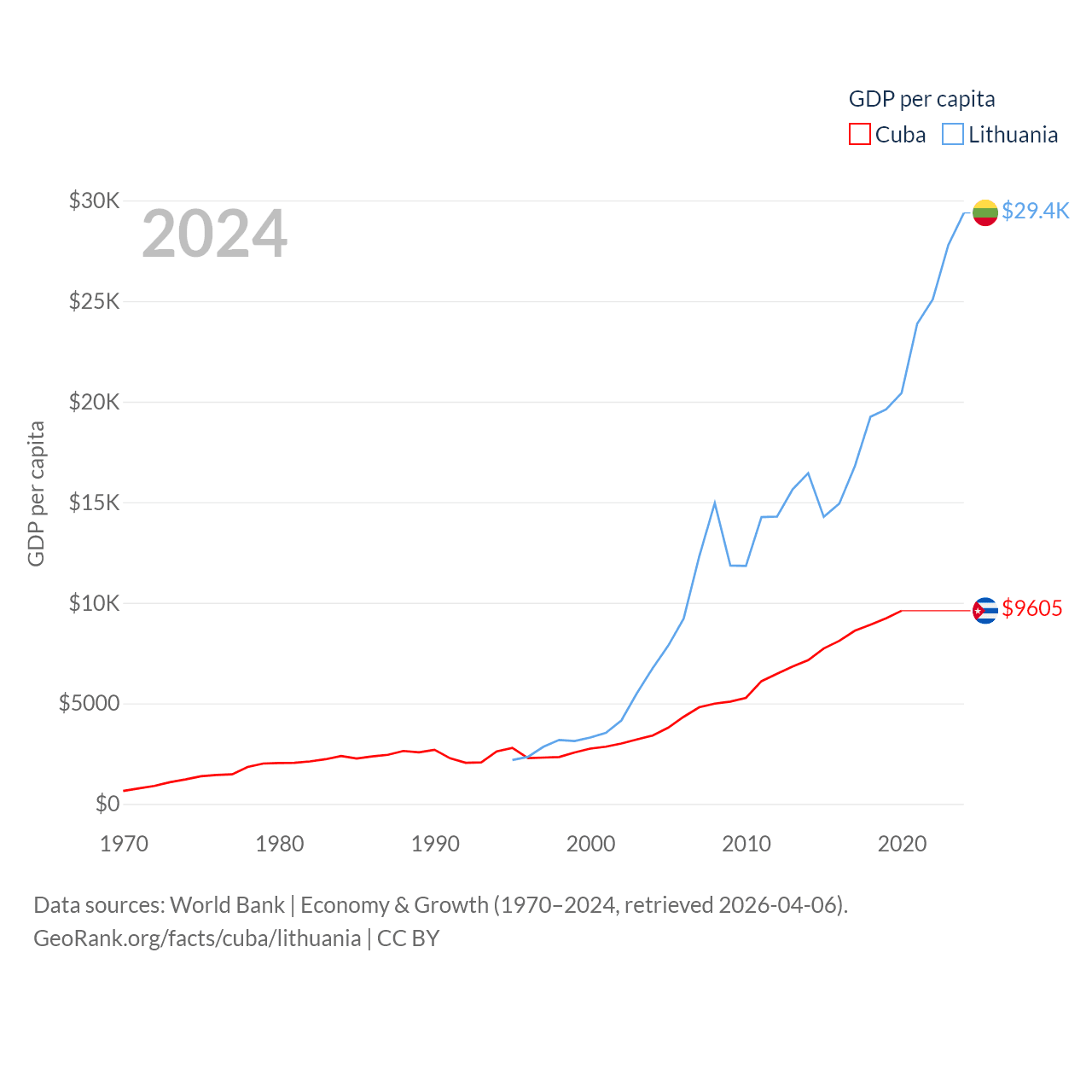 By GDP, Cuba ranks 69/197 ($107B) and Lithuania ranks 79/197 ($84.9B). By GDP per capita, Cuba ranks 86/197 ($9,605), while Lithuania ranks 43/197 ($29,384).