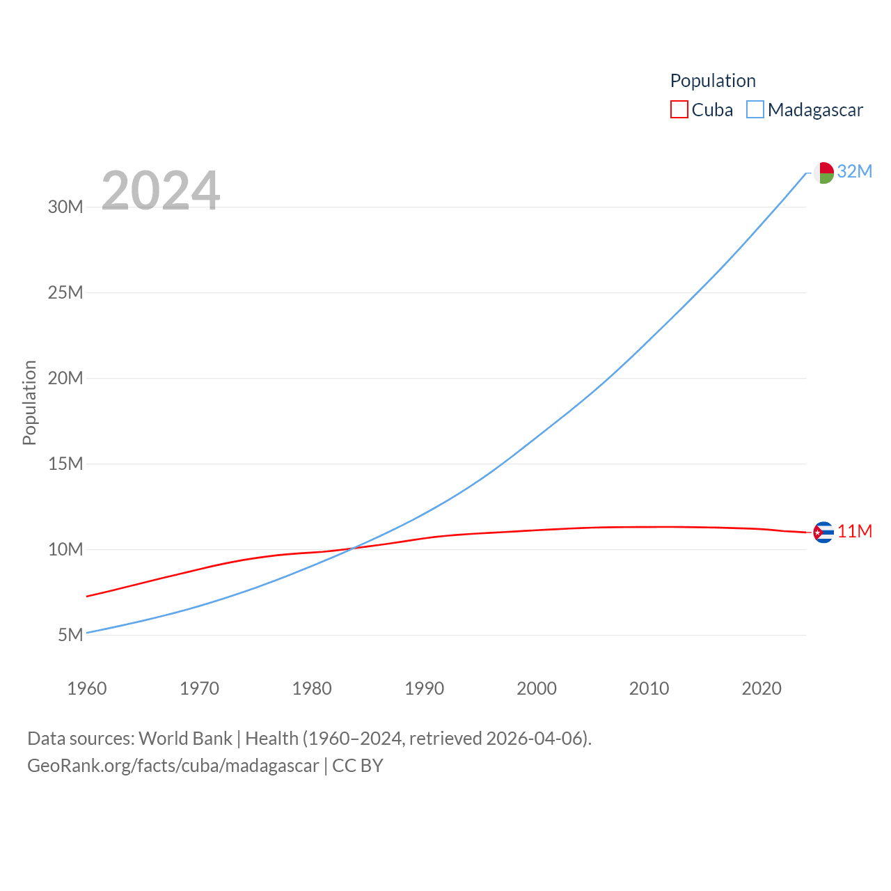Cuba has a population of 11M (ranked 87/197), compared with 32M in Madagascar (ranked 49/197). Cuba's land area is 40,077 sq mi versus 224,634 sq mi for Madagascar (ranked 103rd vs. 44th).