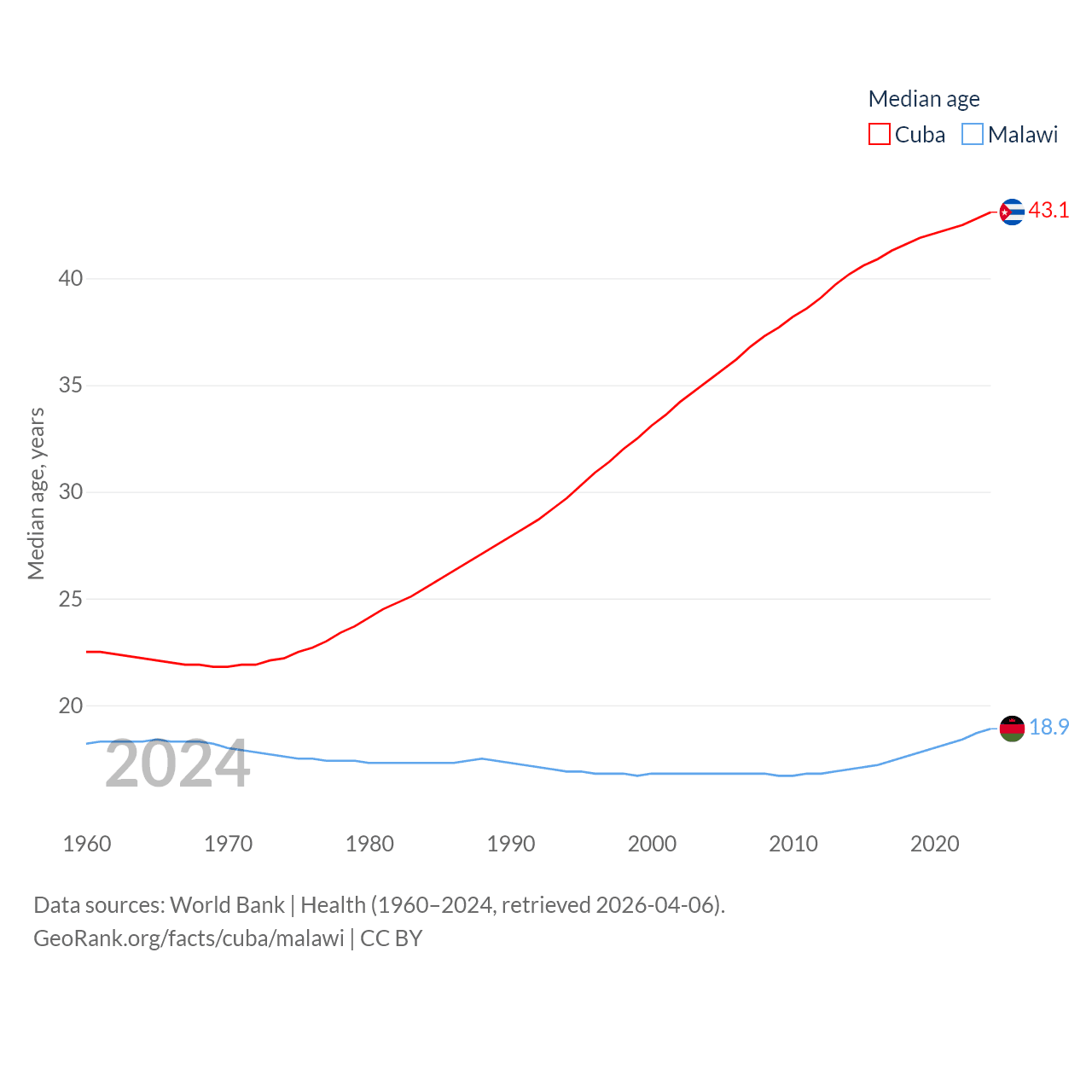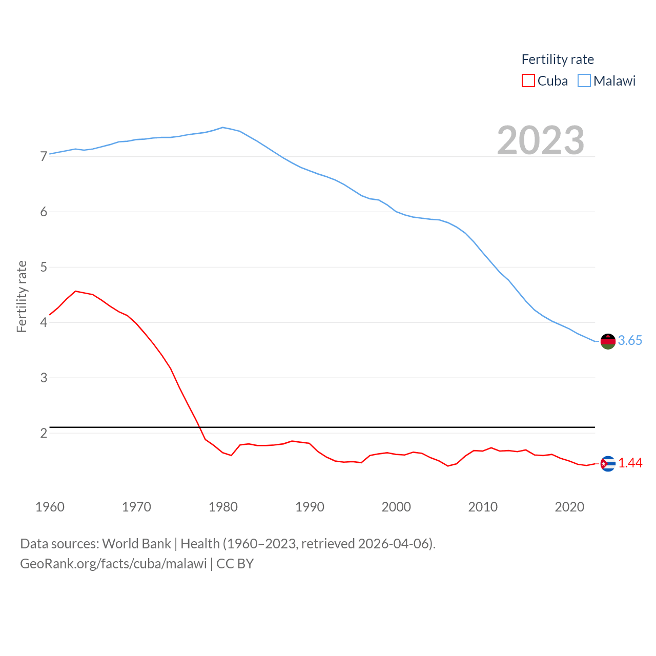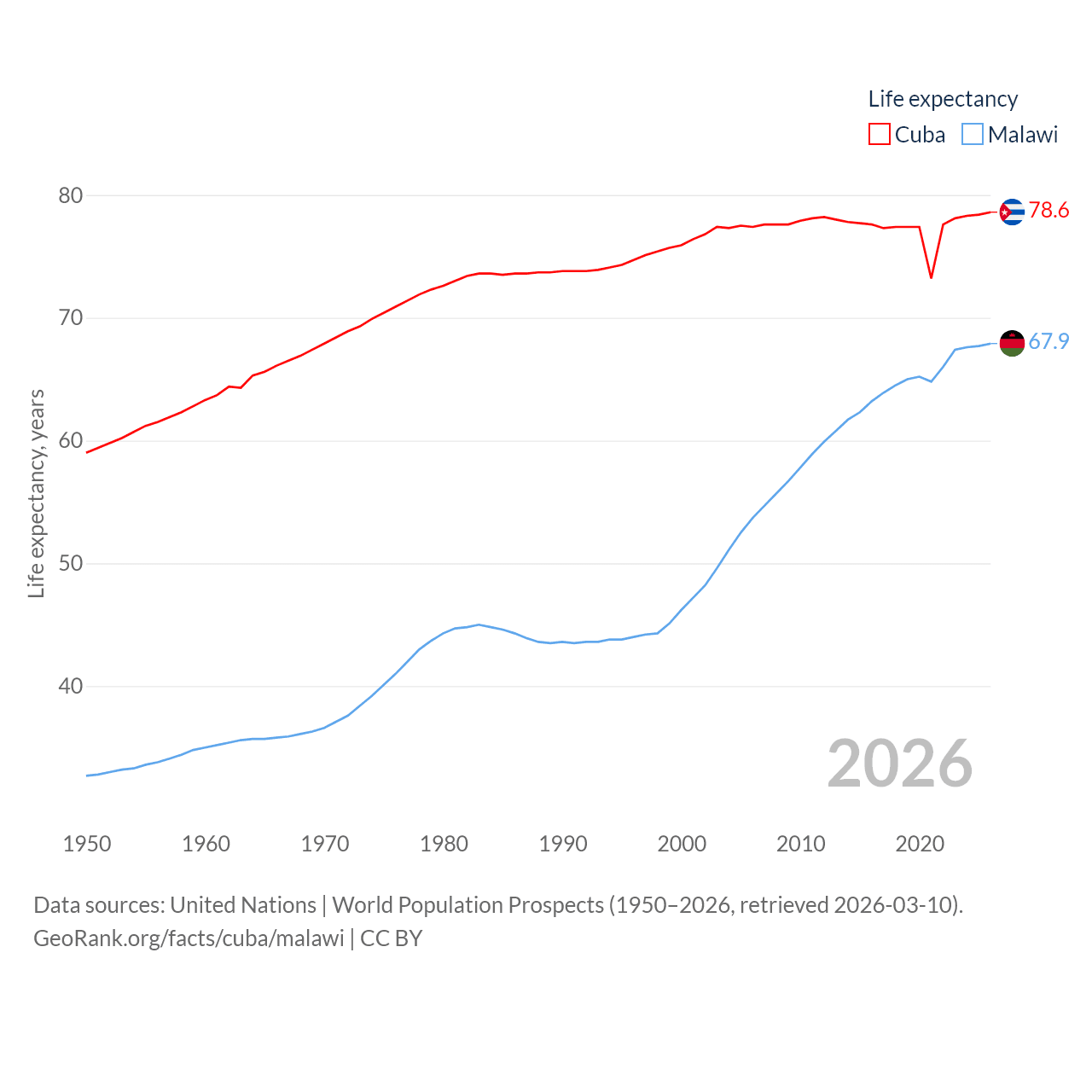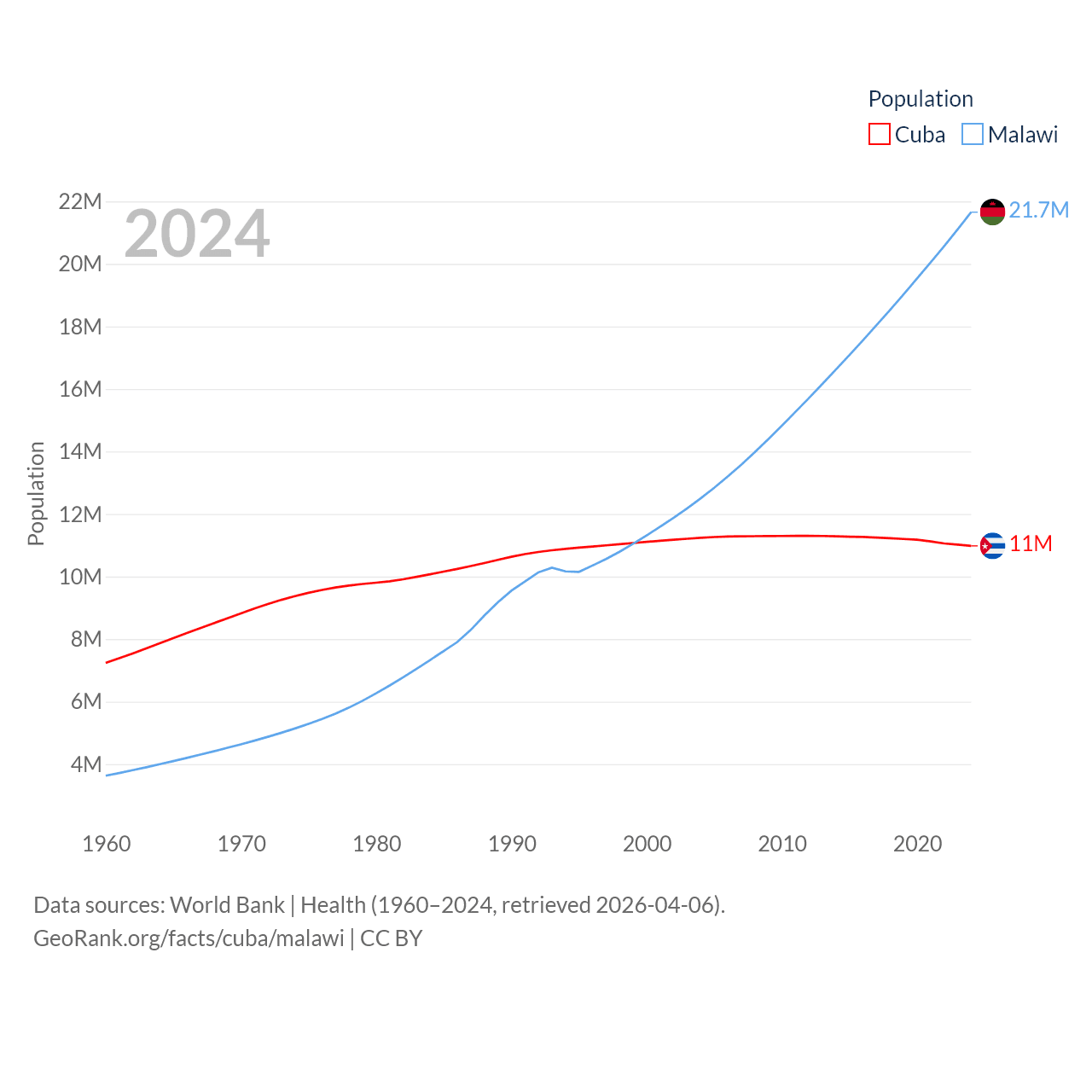 Cuba has a population of 11M (ranked 87/197), compared with 21.7M in Malawi (ranked 62/197). Cuba's land area is 40,077 sq mi versus 36,402 sq mi for Malawi (ranked 103rd vs. 107th).