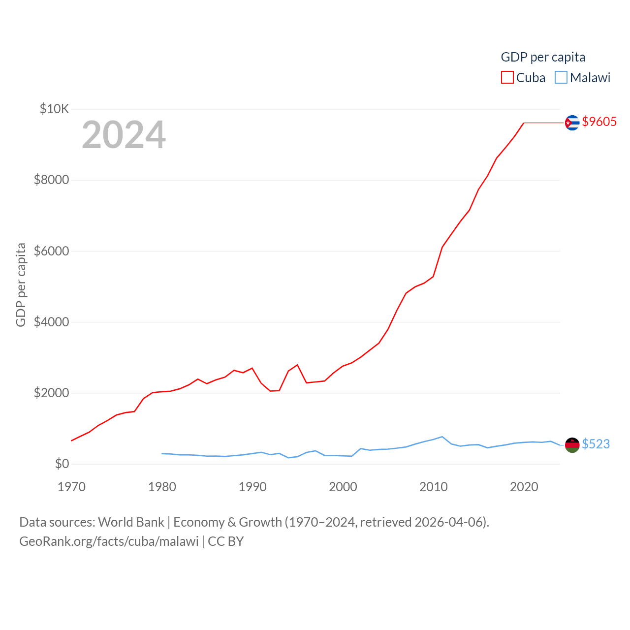 By GDP, Cuba ranks 69/197 ($107B) and Malawi ranks 151/197 ($11.3B). By GDP per capita, Cuba ranks 86/197 ($9,605), while Malawi ranks 194/197 ($523).