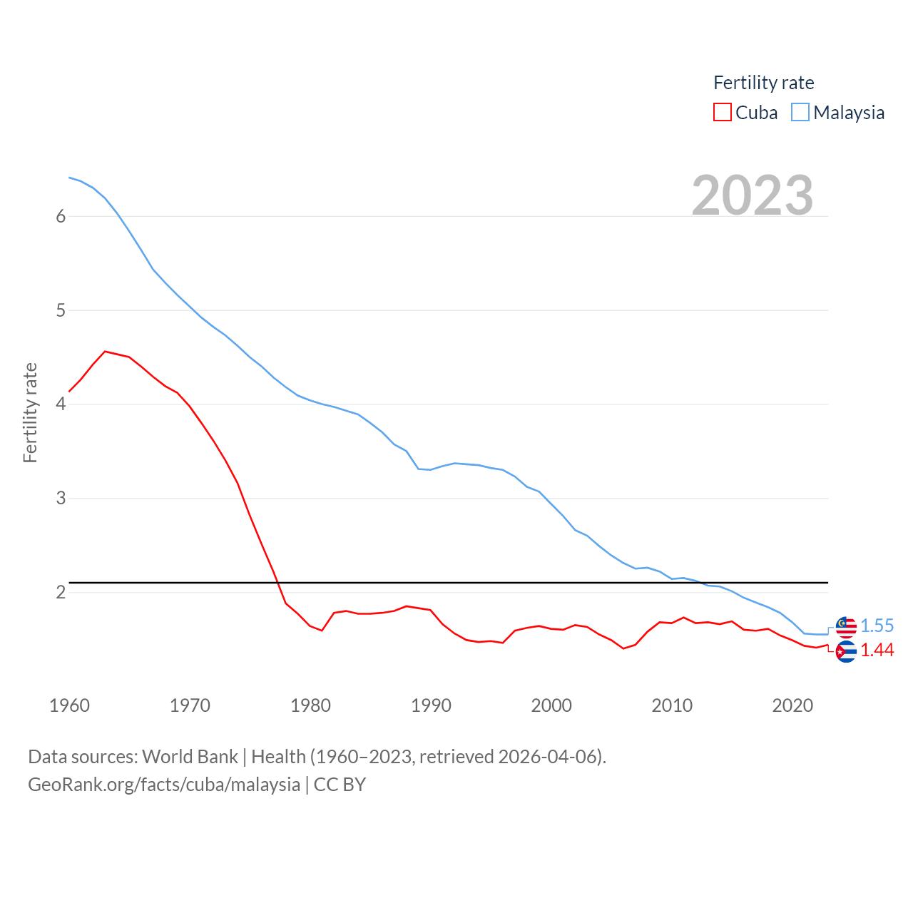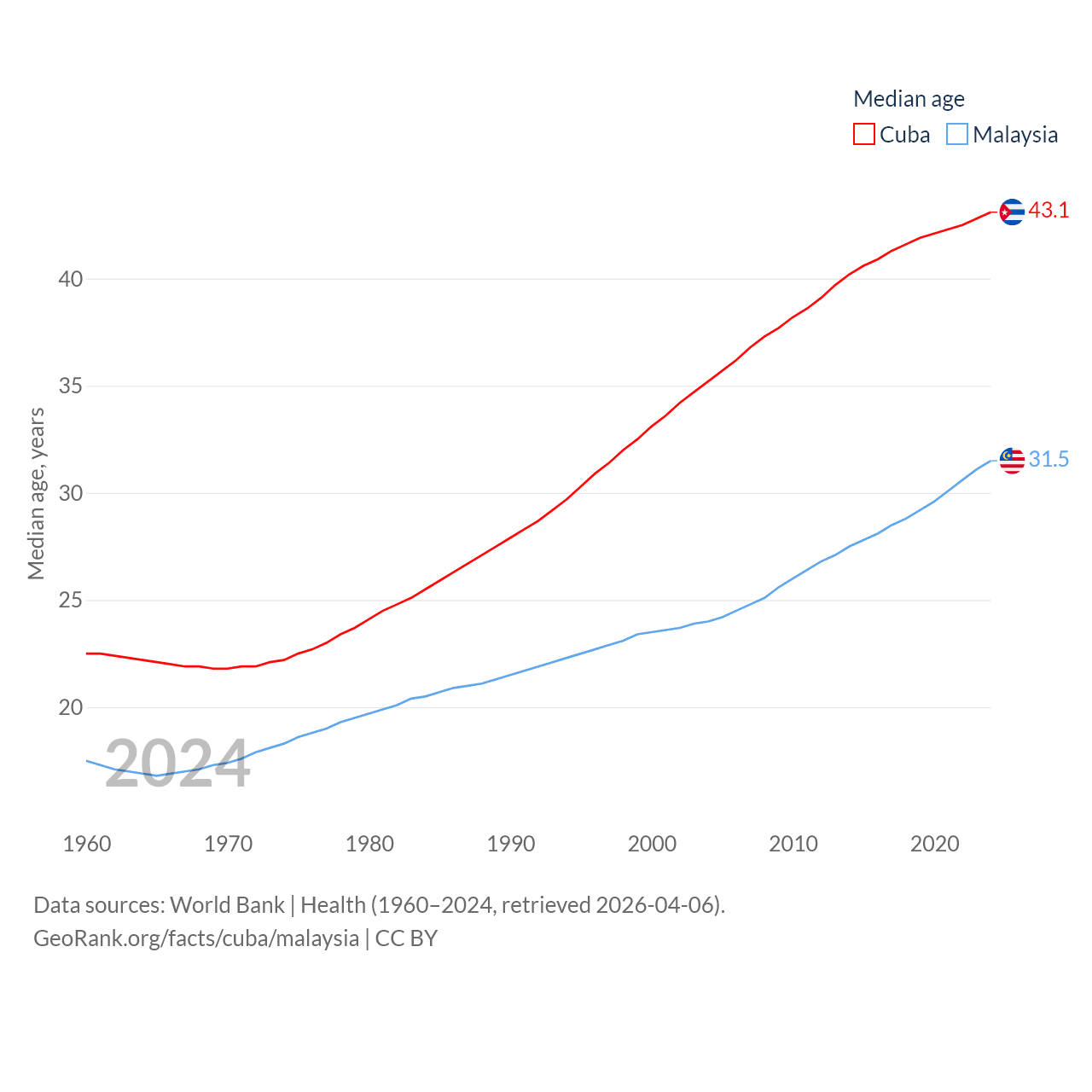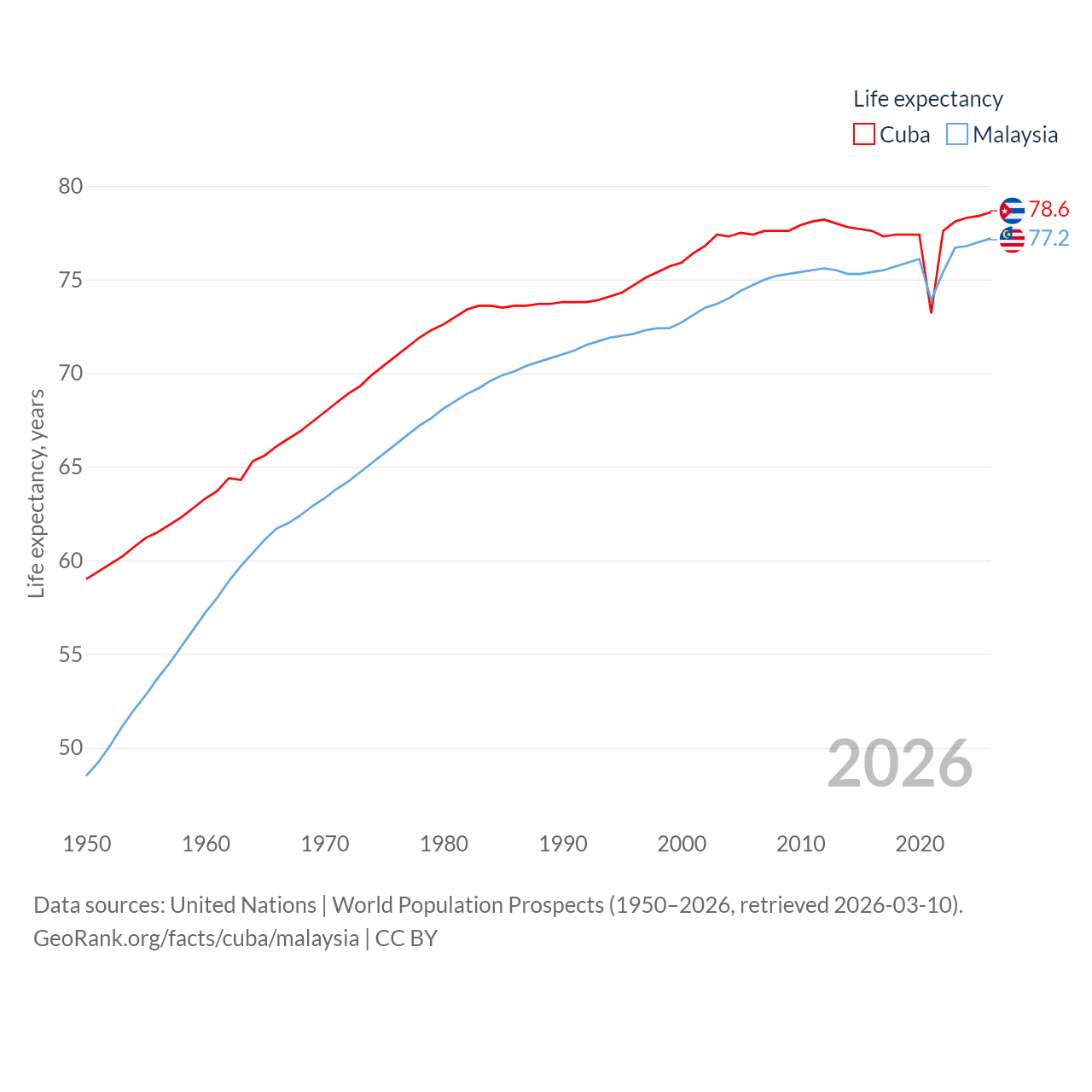 Cuba has a population of 11M (ranked 87/197), compared with 35.6M in Malaysia (ranked 44/197). Cuba's land area is 40,077 sq mi versus 126,854 sq mi for Malaysia (ranked 103rd vs. 65th).