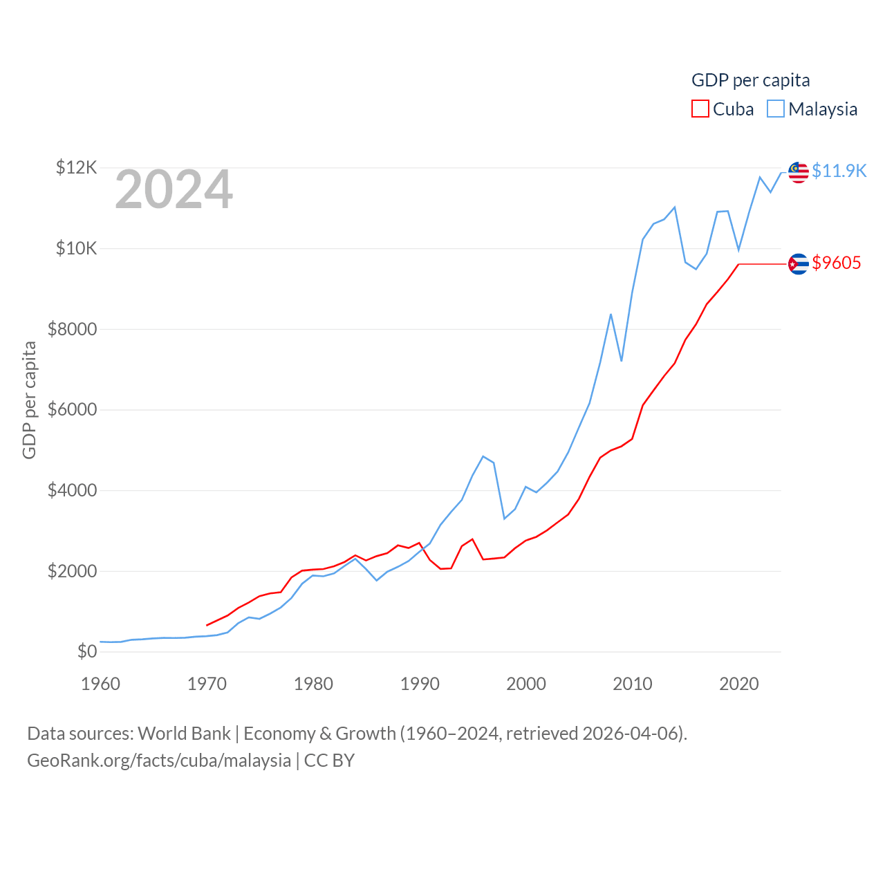 By GDP, Cuba ranks 69/197 ($107B) and Malaysia ranks 38/197 ($422B). By GDP per capita, Cuba ranks 86/197 ($9,605), while Malaysia ranks 79/197 ($11,874).