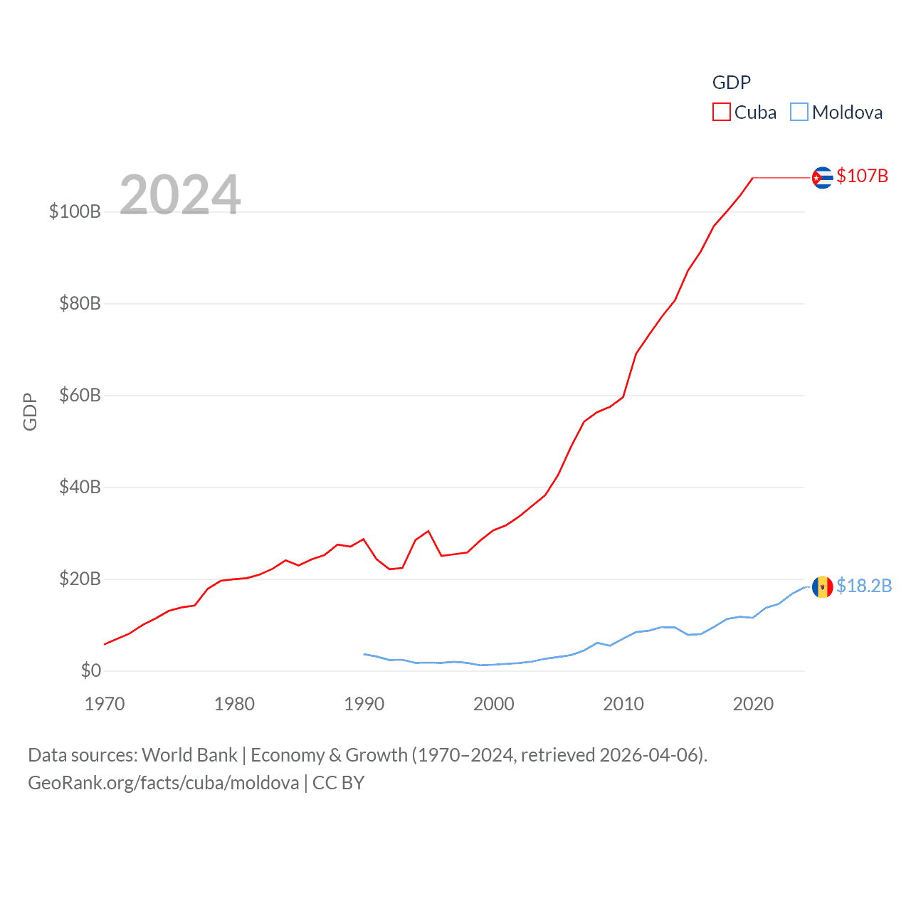 By GDP, Cuba ranks 69/197 ($107B) and Moldova ranks 134/197 ($18.2B). By GDP per capita, Cuba ranks 86/197 ($9,605), while Moldova ranks 99/197 ($7,576).