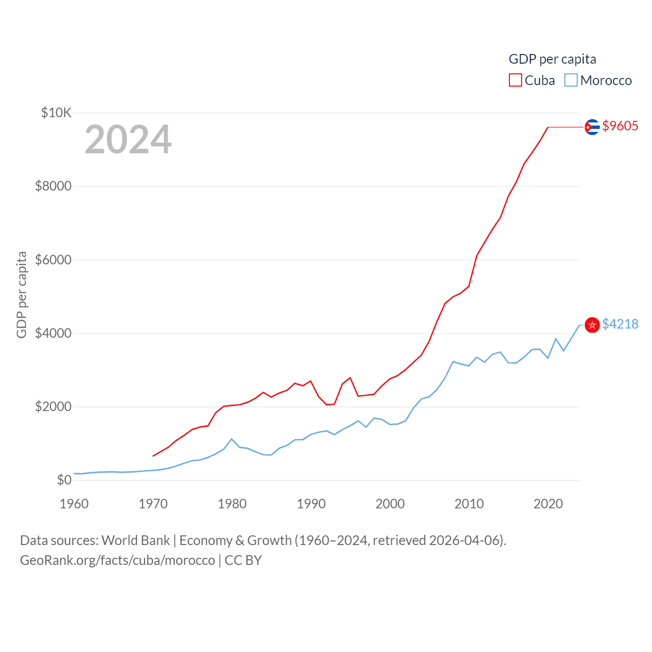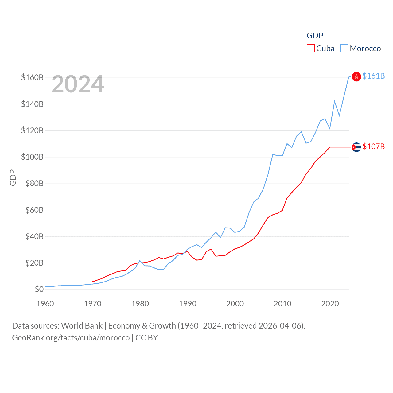 By GDP, Cuba ranks 69/197 ($107B) and Morocco ranks 58/197 ($161B). By GDP per capita, Cuba ranks 86/197 ($9,605), while Morocco ranks 127/197 ($4,218).
