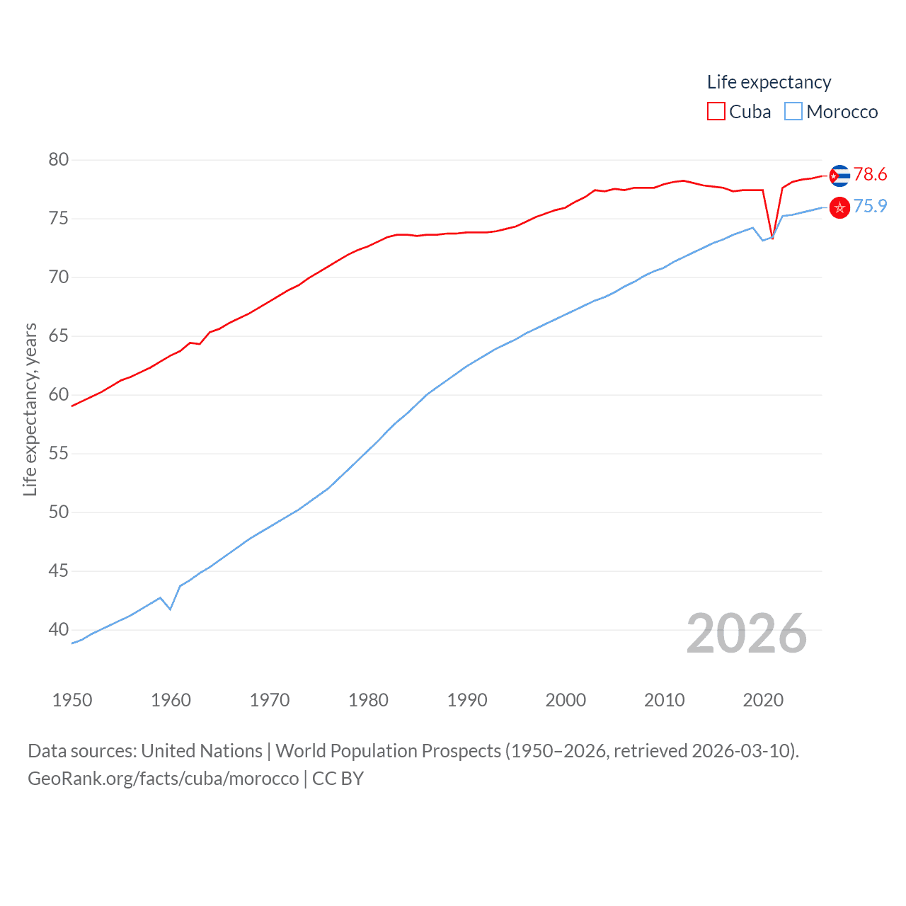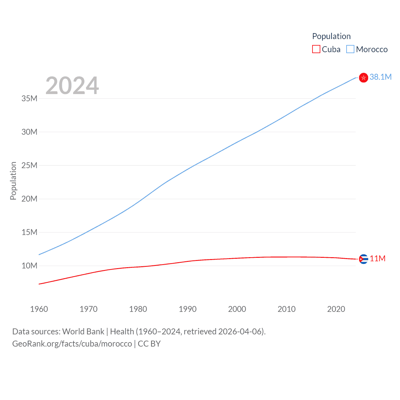 Cuba has a population of 11M (ranked 87/197), compared with 38.1M in Morocco (ranked 39/197). Cuba's land area is 40,077 sq mi versus 172,317 sq mi for Morocco (ranked 103rd vs. 55th).