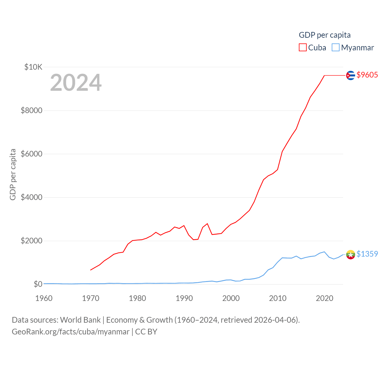 By GDP, Cuba ranks 69/197 ($107B) and Myanmar ranks 85/197 ($74.1B). By GDP per capita, Cuba ranks 86/197 ($9,605), while Myanmar ranks 165/197 ($1,359).