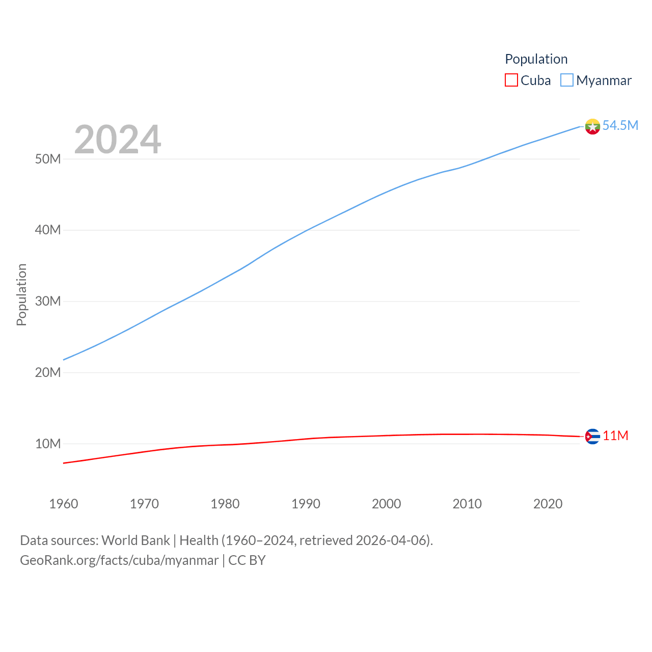 Cuba has a population of 11M (ranked 87/197), compared with 54.5M in Myanmar (ranked 27/197). Cuba's land area is 40,077 sq mi versus 251,997 sq mi for Myanmar (ranked 103rd vs. 39th).