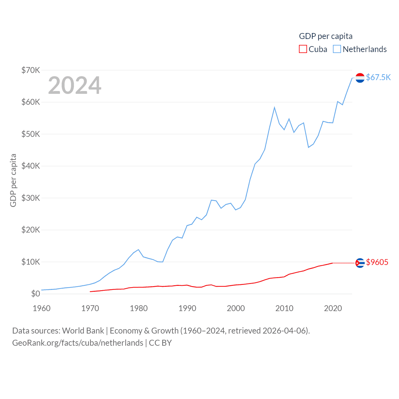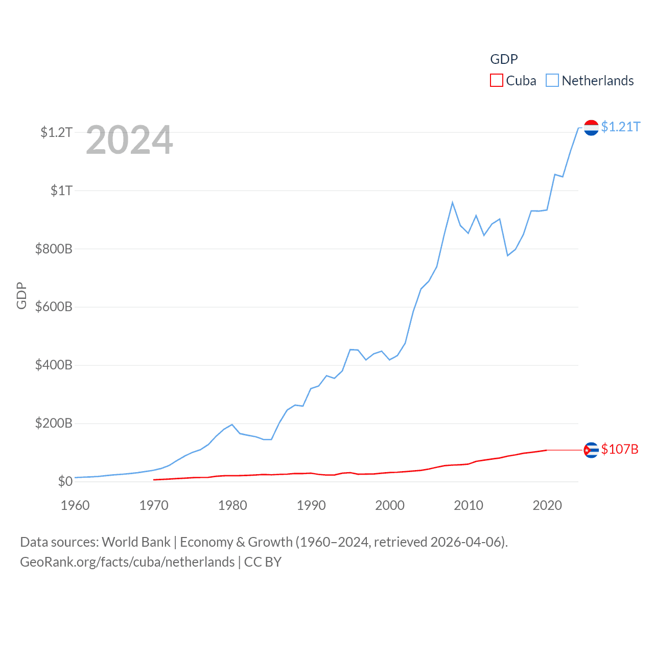 By GDP, Cuba ranks 69/197 ($107B) and The Netherlands ranks 19/197 ($1.21T). By GDP per capita, Cuba ranks 86/197 ($9,605), while The Netherlands ranks 13/197 ($67,520).