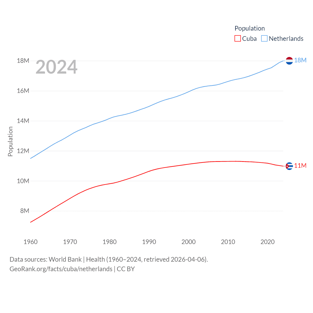Cuba has a population of 11M (ranked 87/197), compared with 18M in The Netherlands (ranked 72/197). Cuba's land area is 40,077 sq mi versus 13,000 sq mi for The Netherlands (ranked 103rd vs. 134th).