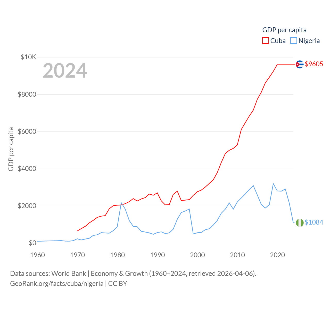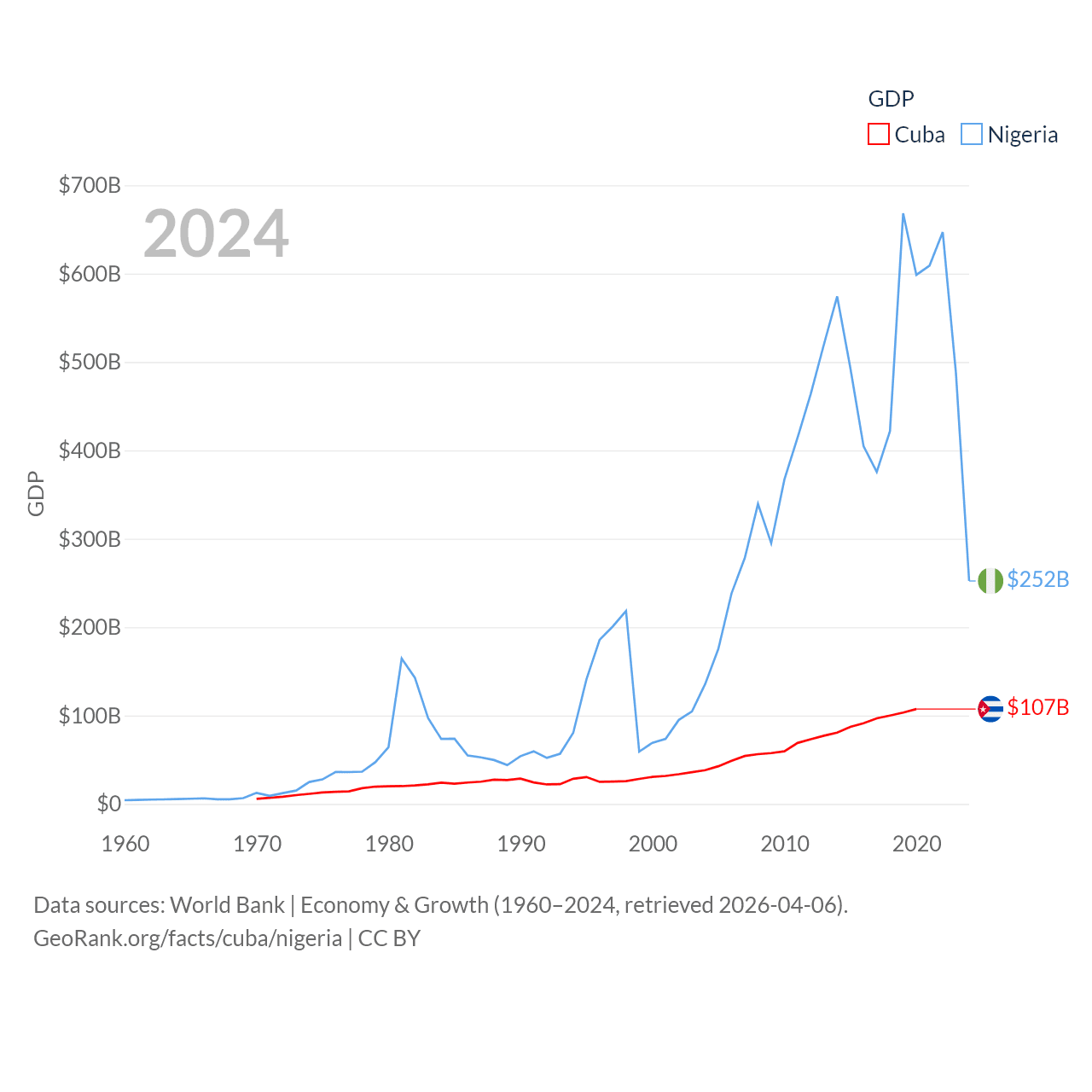 By GDP, Cuba ranks 69/197 ($107B) and Nigeria ranks 54/197 ($252B). By GDP per capita, Cuba ranks 86/197 ($9,605), while Nigeria ranks 174/197 ($1,084).
