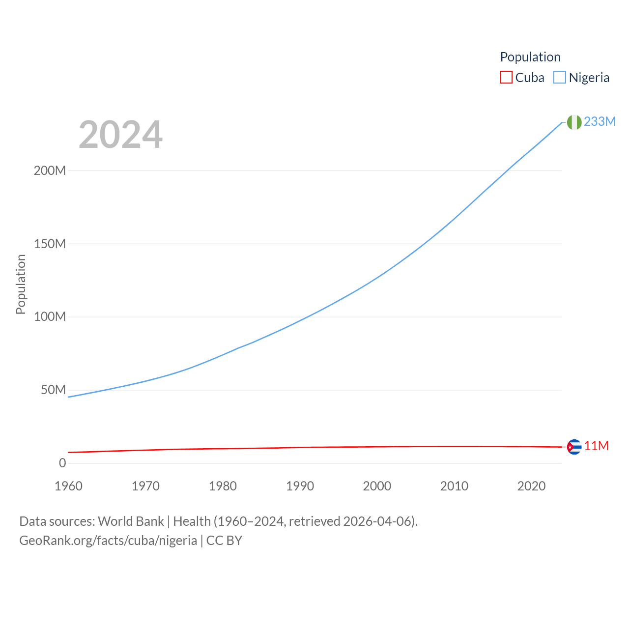 Cuba has a population of 11M (ranked 87/197), compared with 233M in Nigeria (ranked 6/197). Cuba's land area is 40,077 sq mi versus 351,650 sq mi for Nigeria (ranked 103rd vs. 30th).