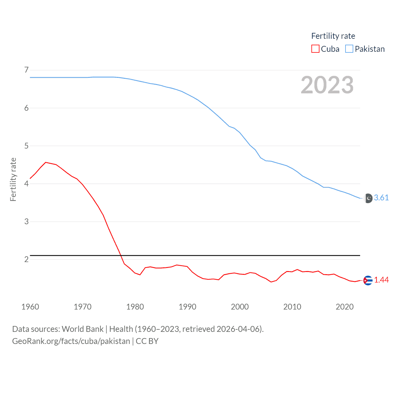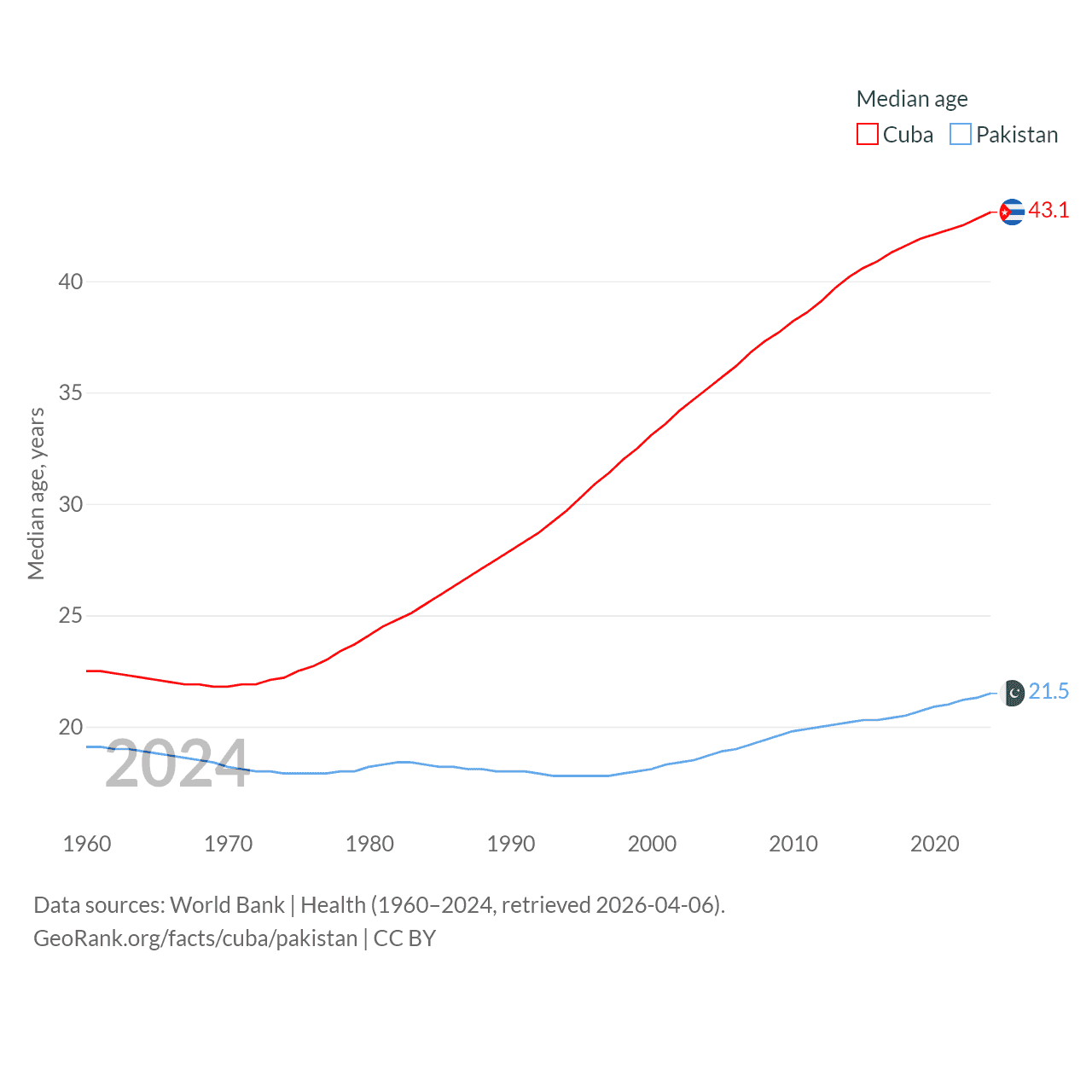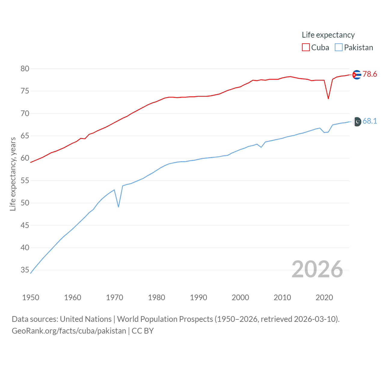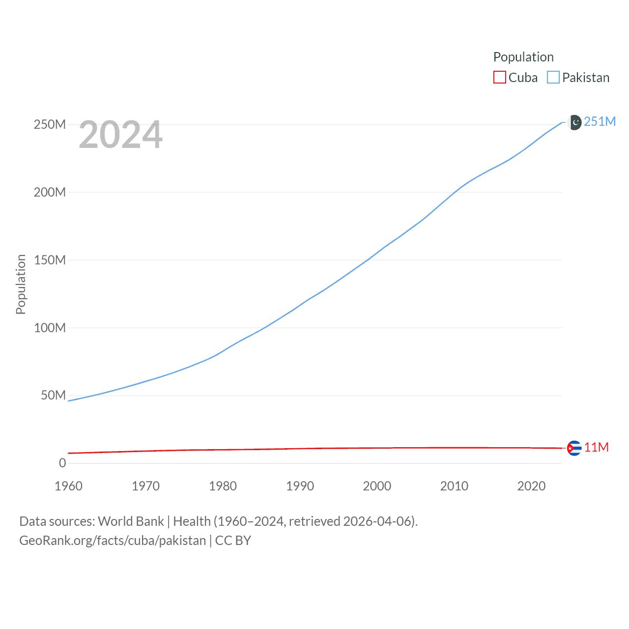 Cuba has a population of 11M (ranked 87/197), compared with 251M in Pakistan (ranked 5/197). Cuba's land area is 40,077 sq mi versus 297,638 sq mi for Pakistan (ranked 103rd vs. 35th).