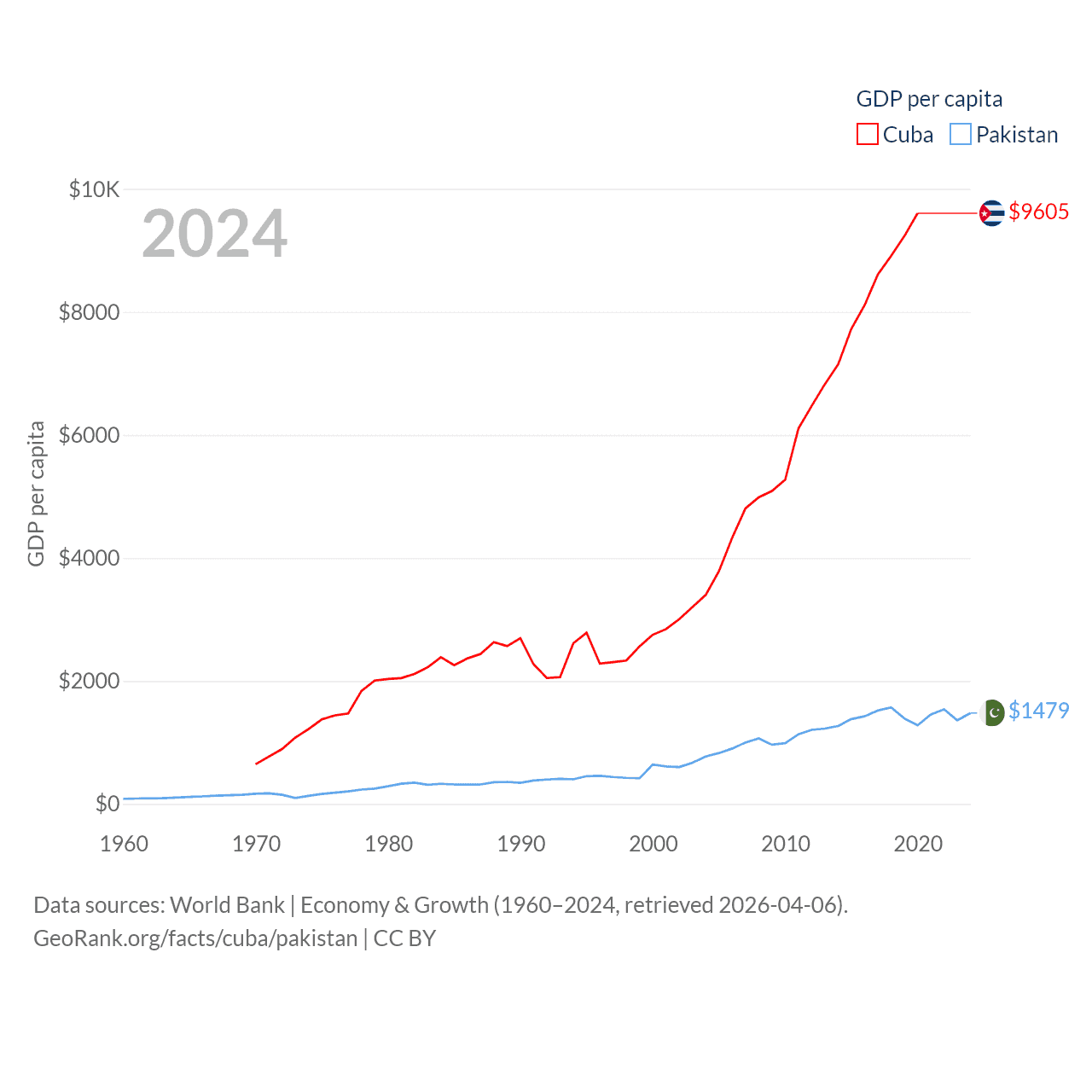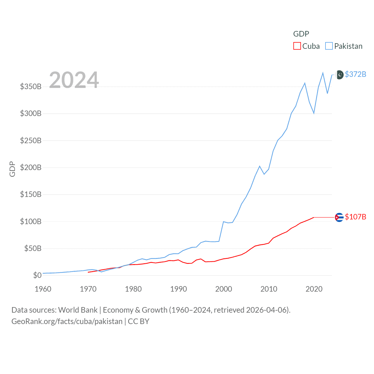 By GDP, Cuba ranks 69/197 ($107B) and Pakistan ranks 43/197 ($372B). By GDP per capita, Cuba ranks 86/197 ($9,605), while Pakistan ranks 163/197 ($1,479).