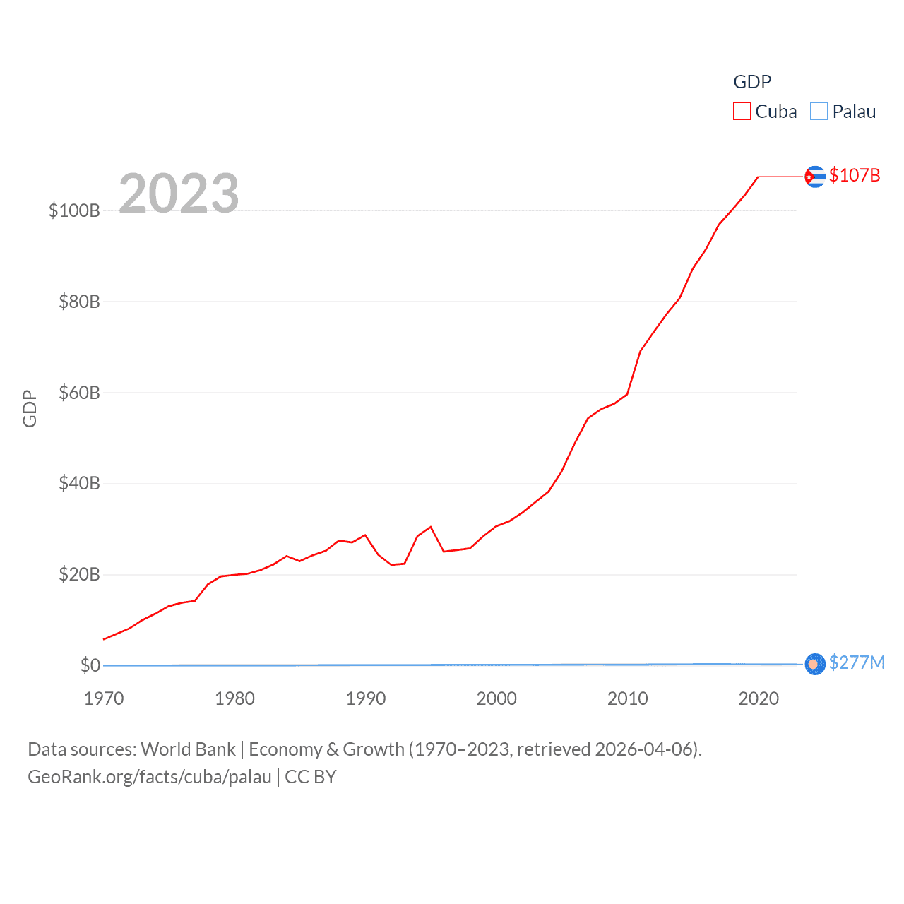 By GDP, Cuba ranks 69/197 ($107B) and Palau ranks 194/197 ($277M). By GDP per capita, Cuba ranks 86/197 ($9,605), while Palau ranks 67/197 ($15,611).