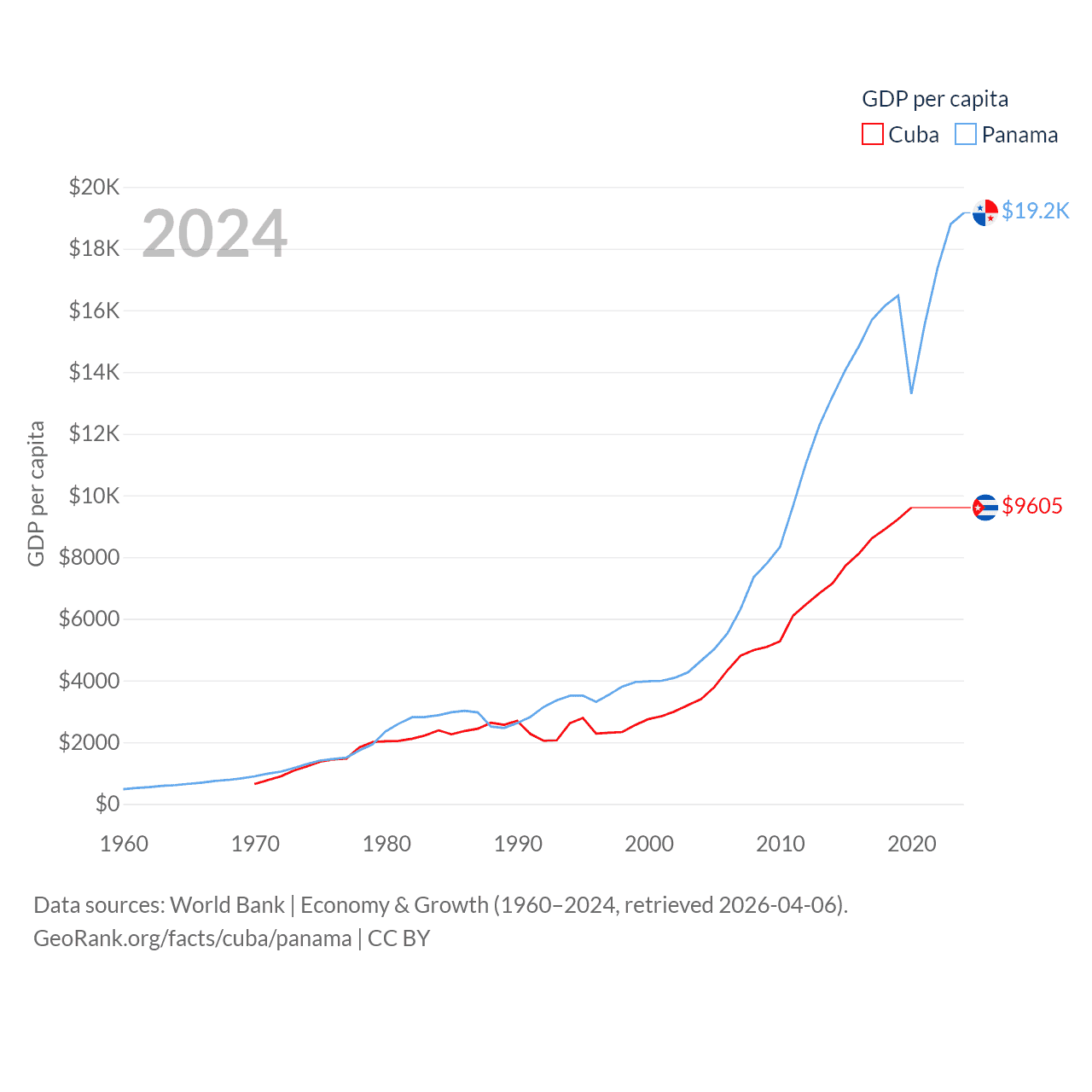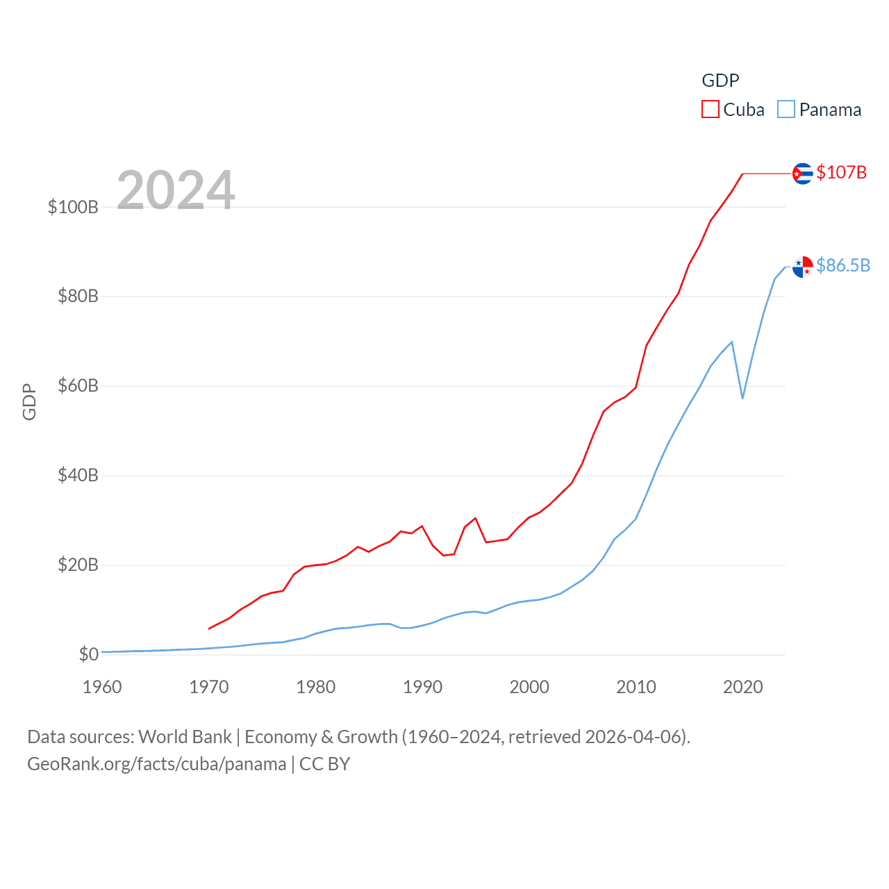 By GDP, Cuba ranks 69/197 ($107B) and Panama ranks 78/197 ($86.5B). By GDP per capita, Cuba ranks 86/197 ($9,605), while Panama ranks 60/197 ($19,161).
