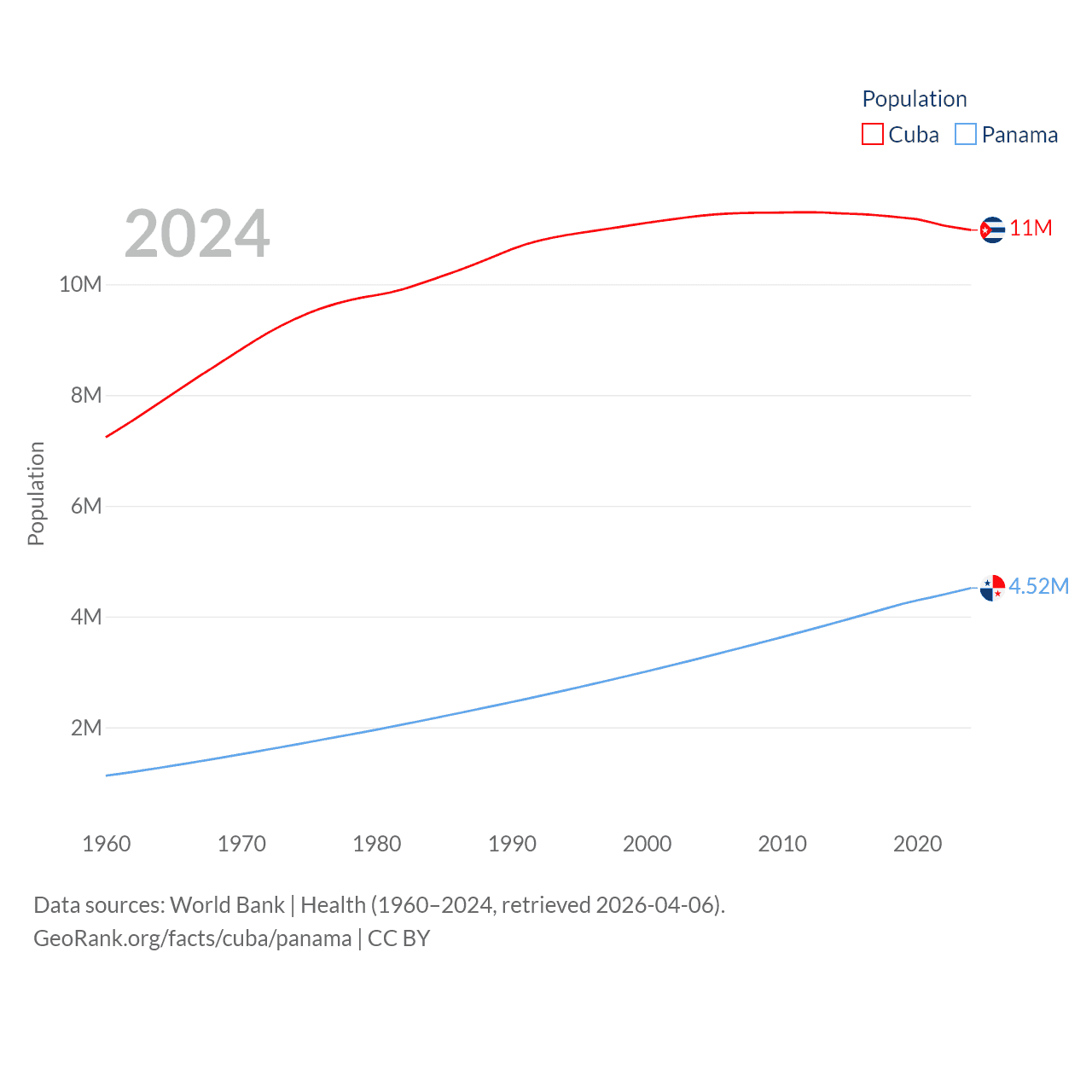 Cuba has a population of 11M (ranked 87/197), compared with 4.52M in Panama (ranked 128/197). Cuba's land area is 40,077 sq mi versus 28,641 sq mi for Panama (ranked 103rd vs. 115th).