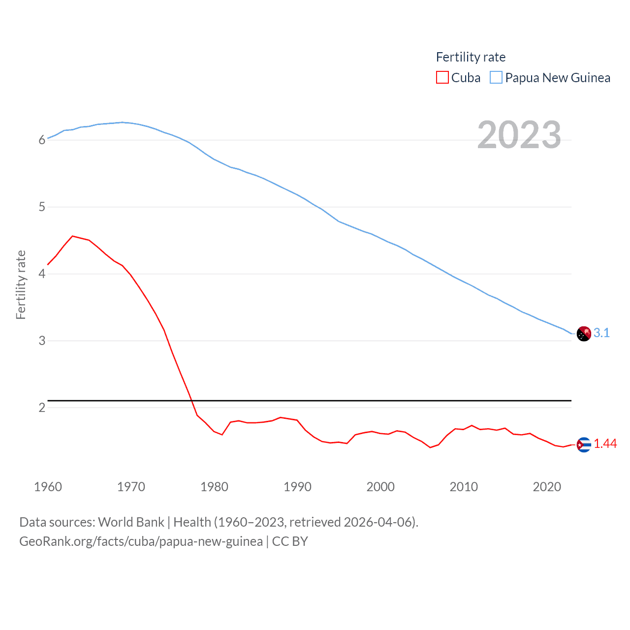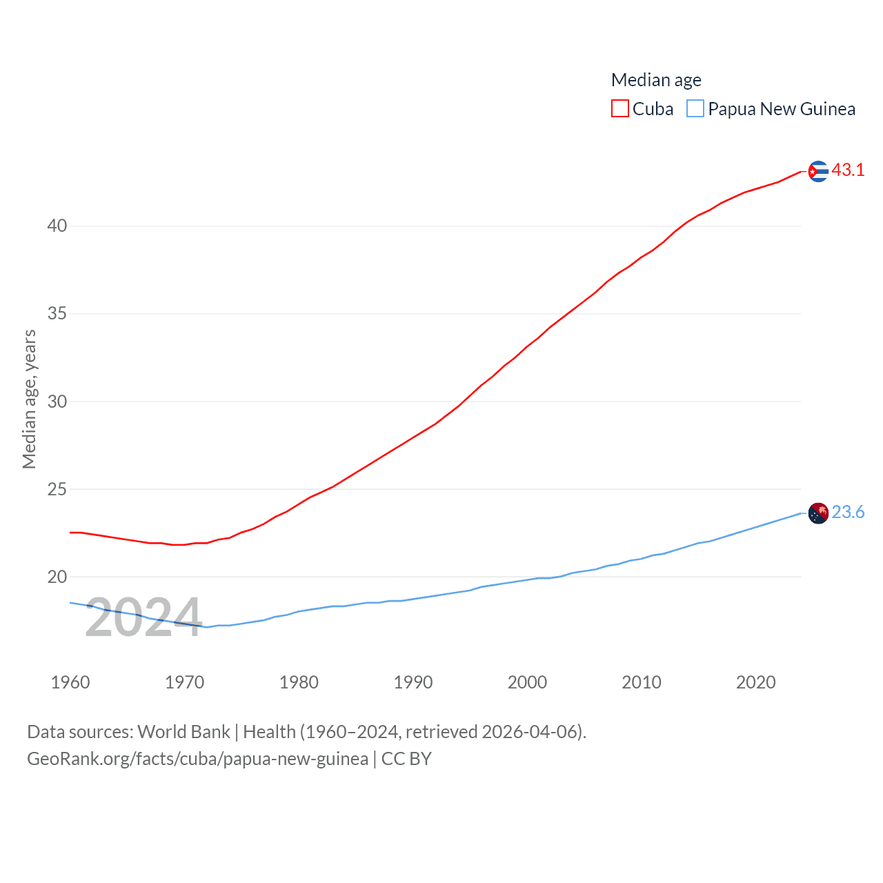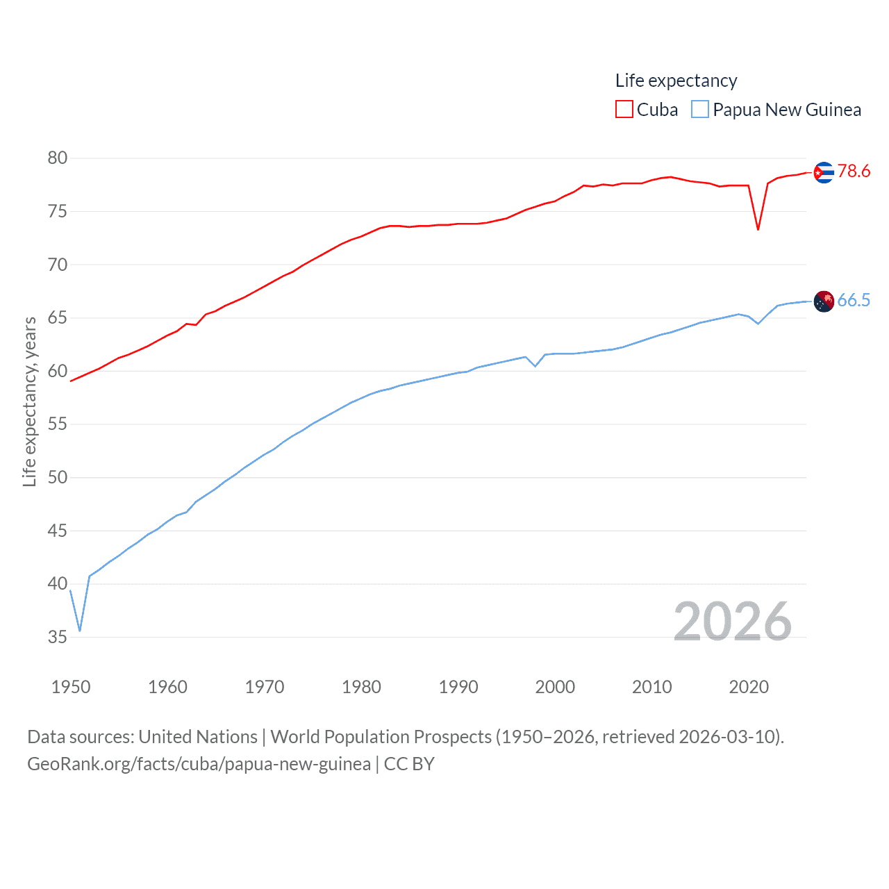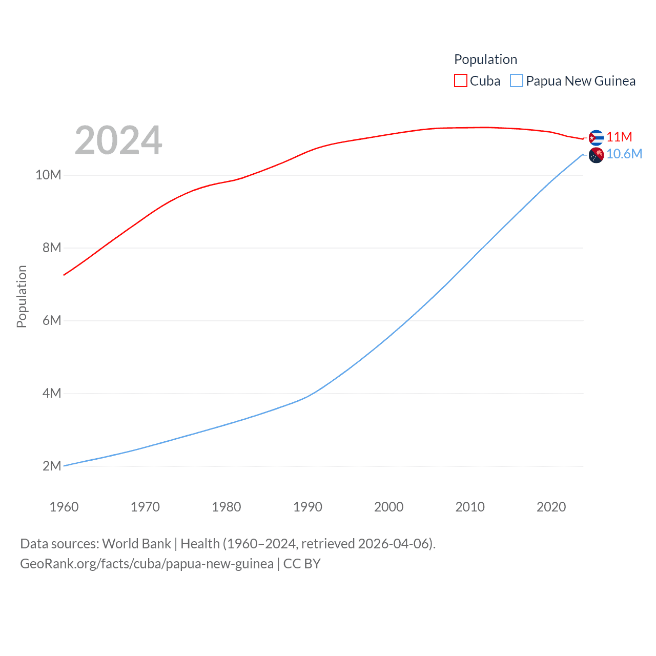 Cuba has a population of 11M (ranked 87/197), compared with 10.6M in Papua New Guinea (ranked 92/197). Cuba's land area is 40,077 sq mi versus 174,850 sq mi for Papua New Guinea (ranked 103rd vs. 54th).