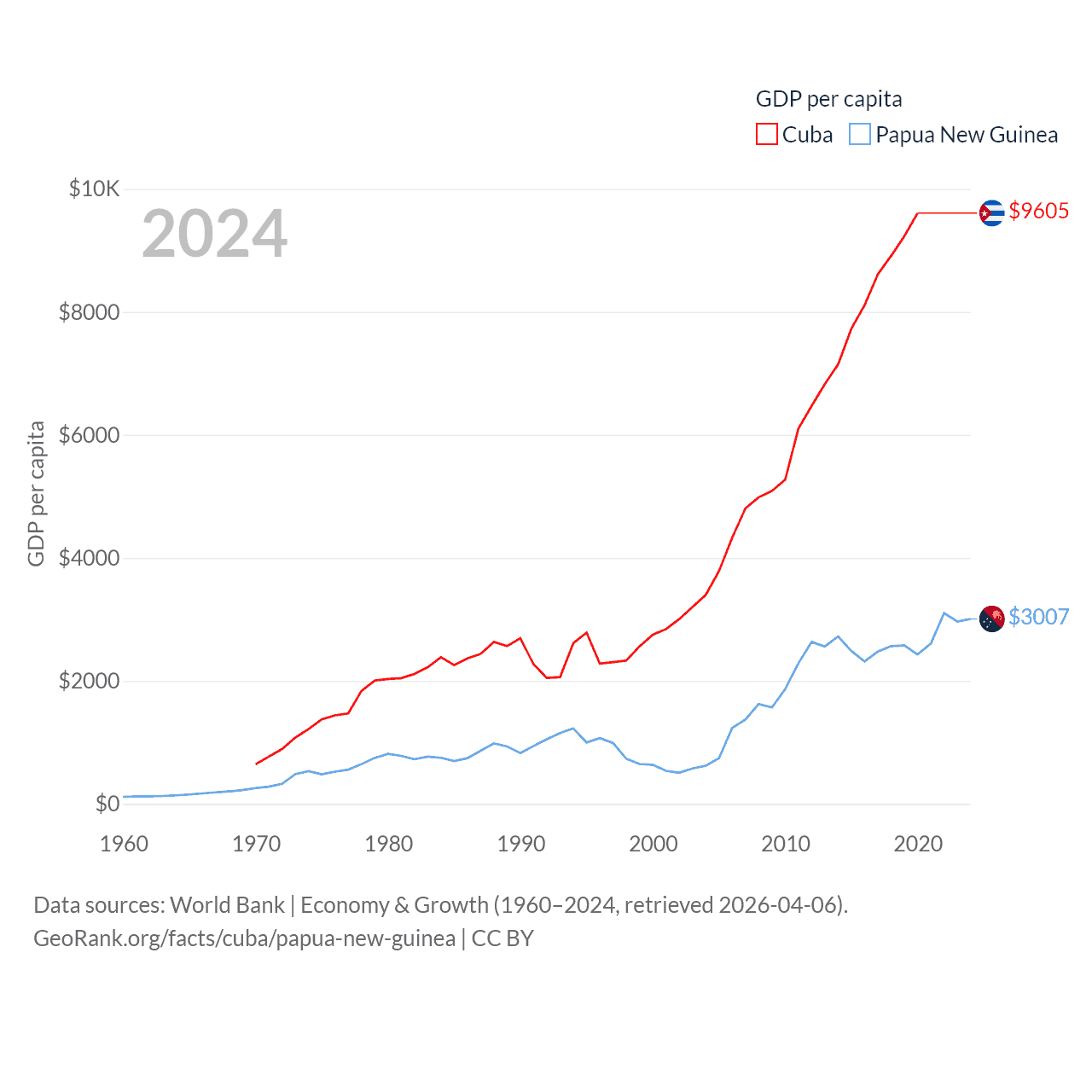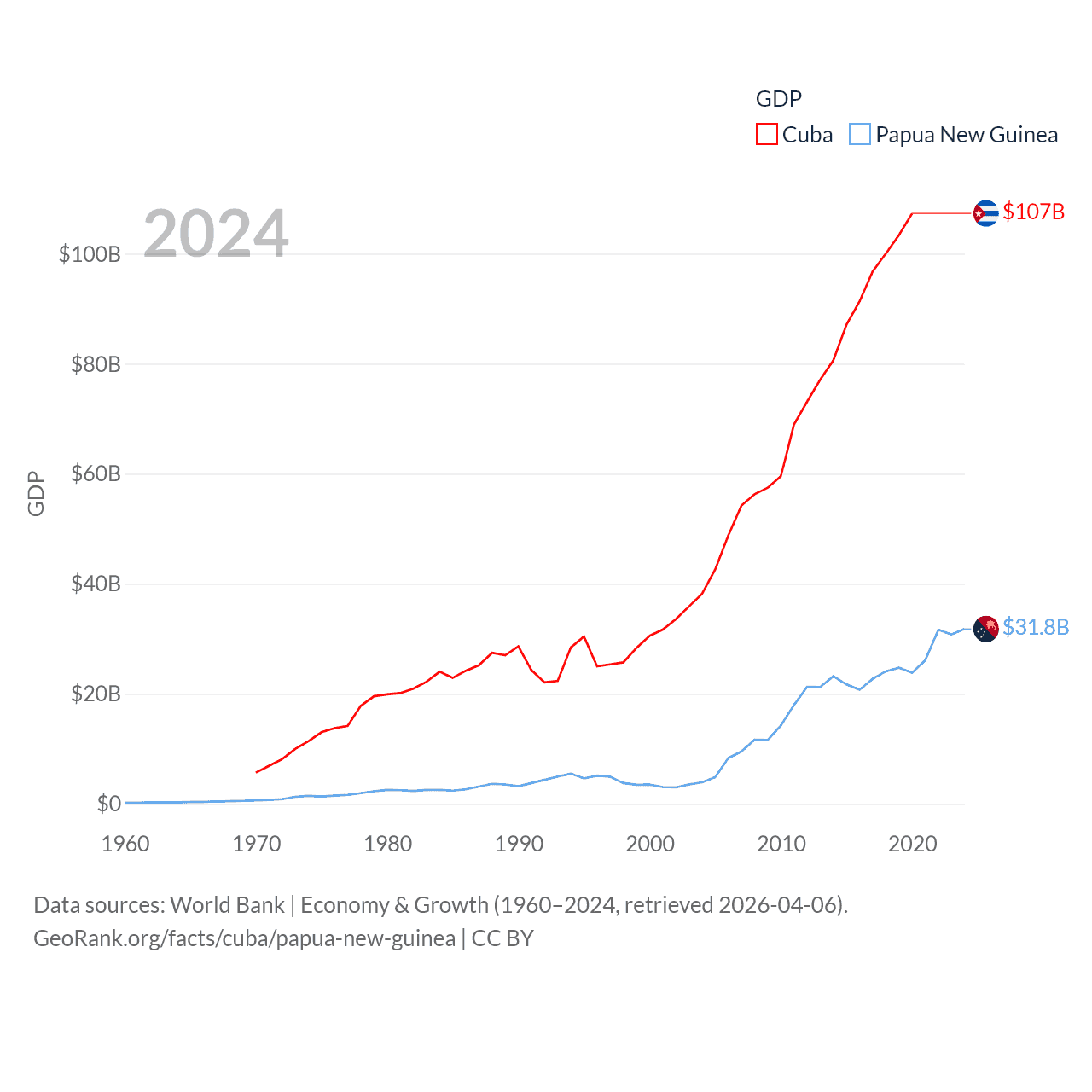 By GDP, Cuba ranks 69/197 ($107B) and Papua New Guinea ranks 110/197 ($31.8B). By GDP per capita, Cuba ranks 86/197 ($9,605), while Papua New Guinea ranks 140/197 ($3,007).