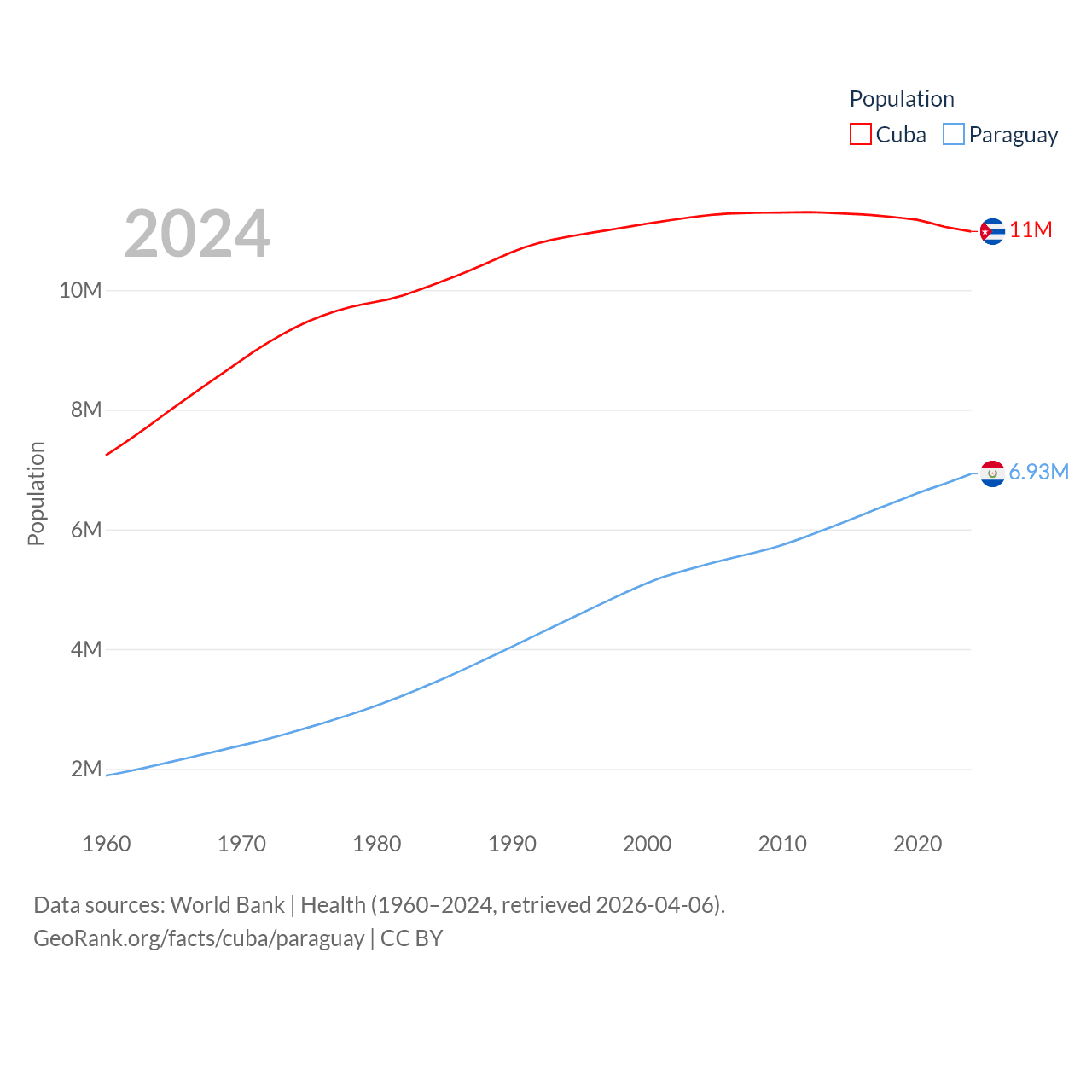 Cuba has a population of 11M (ranked 87/197), compared with 6.93M in Paraguay (ranked 107/197). Cuba's land area is 40,077 sq mi versus 152,901 sq mi for Paraguay (ranked 103rd vs. 59th).