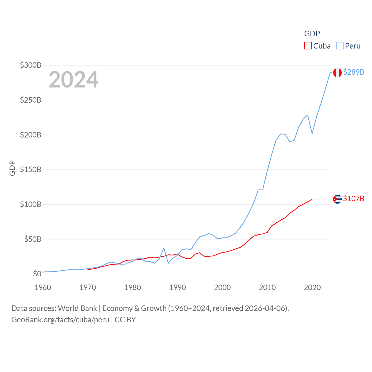 By GDP, Cuba ranks 69/197 ($107B) and Peru ranks 49/197 ($289B). By GDP per capita, Cuba ranks 86/197 ($9,605), while Peru ranks 91/197 ($8,452).