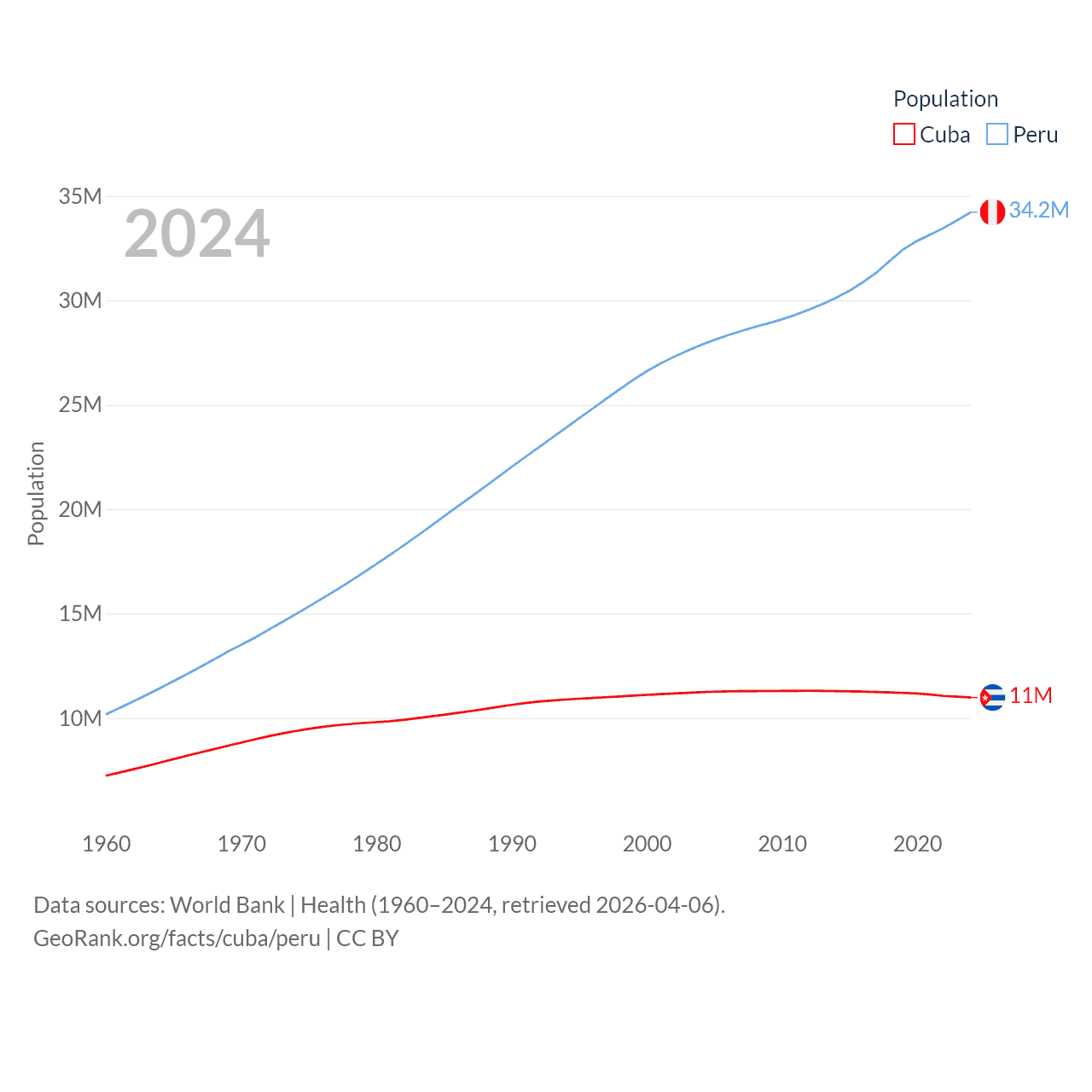 Cuba has a population of 11M (ranked 87/197), compared with 34.2M in Peru (ranked 48/197). Cuba's land area is 40,077 sq mi versus 494,211 sq mi for Peru (ranked 103rd vs. 19th).