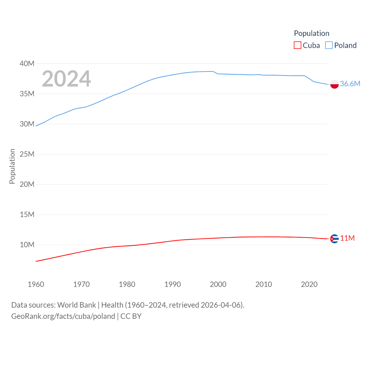 Cuba has a population of 11M (ranked 87/197), compared with 36.6M in Poland (ranked 42/197). Cuba's land area is 40,077 sq mi versus 118,252 sq mi for Poland (ranked 103rd vs. 69th).