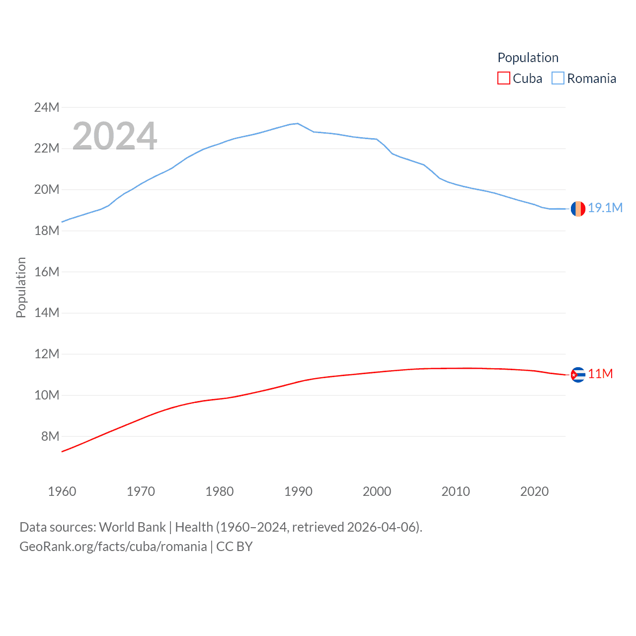 Cuba has a population of 11M (ranked 87/197), compared with 19.1M in Romania (ranked 67/197). Cuba's land area is 40,077 sq mi versus 88,834 sq mi for Romania (ranked 103rd vs. 80th).