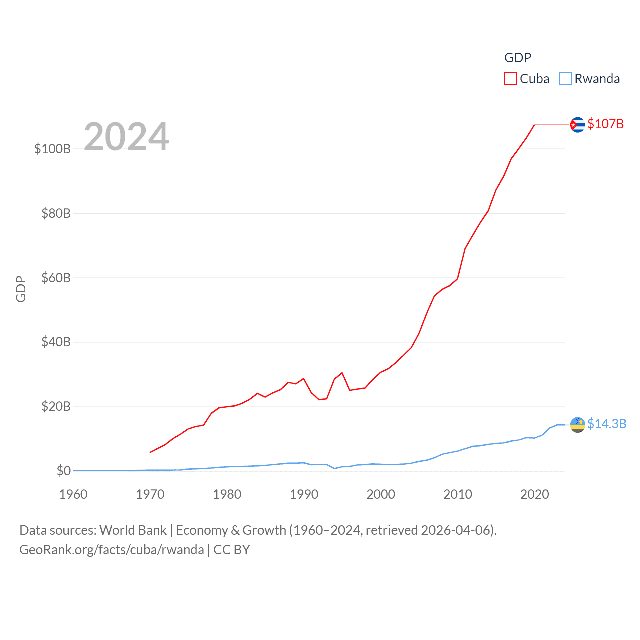 By GDP, Cuba ranks 69/197 ($107B) and Rwanda ranks 144/197 ($14.3B). By GDP per capita, Cuba ranks 86/197 ($9,605), while Rwanda ranks 178/197 ($1,000).