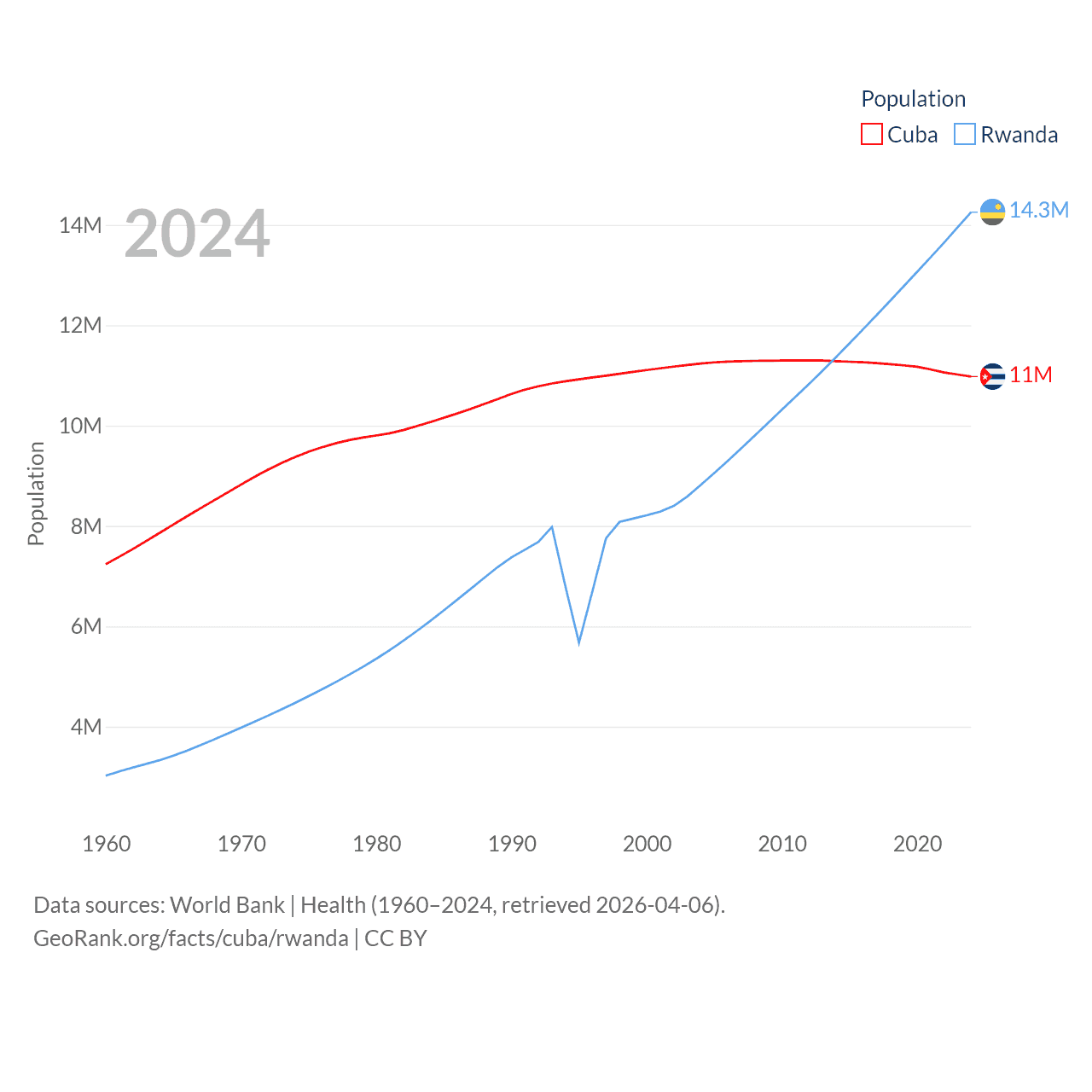 Cuba has a population of 11M (ranked 87/197), compared with 14.3M in Rwanda (ranked 77/197). Cuba's land area is 40,077 sq mi versus 9,525 sq mi for Rwanda (ranked 103rd vs. 146th).