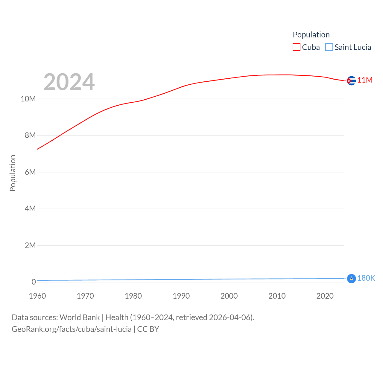 Cuba has a population of 11M (ranked 87/197), compared with 180K in Saint Lucia (ranked 178/197). Cuba's land area is 40,077 sq mi versus 235.5 sq mi for Saint Lucia (ranked 103rd vs. 178th).