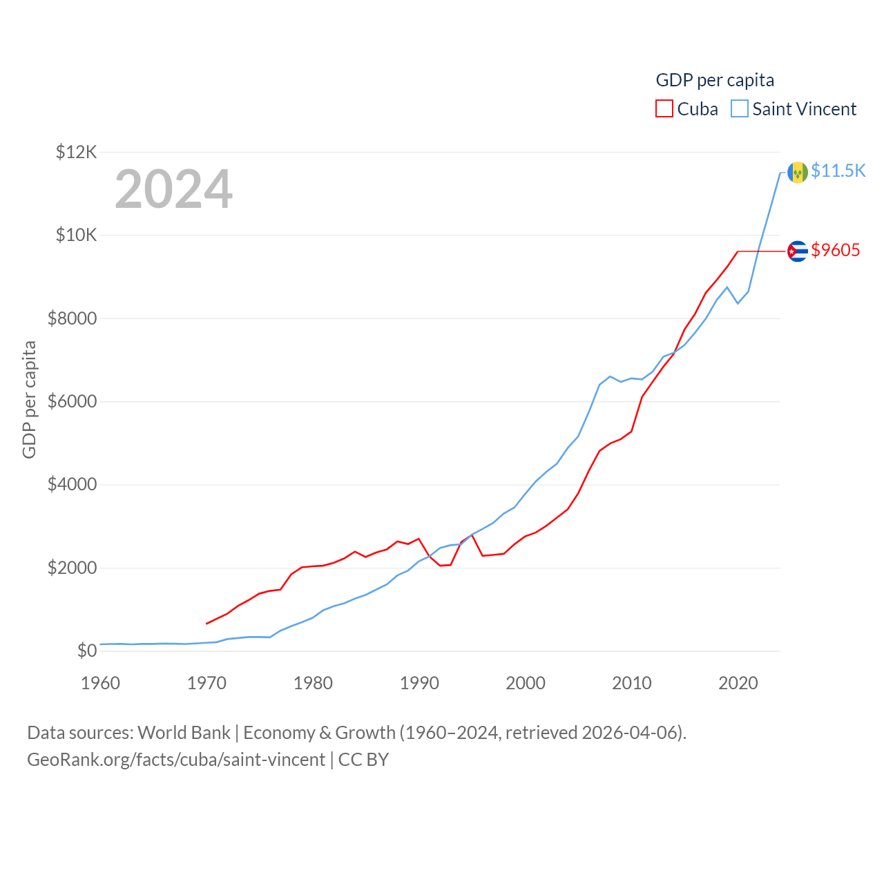 By GDP, Cuba ranks 69/197 ($107B) and Saint Vincent ranks 186/197 ($1.16B). By GDP per capita, Cuba ranks 86/197 ($9,605), while Saint Vincent ranks 81/197 ($11,501).