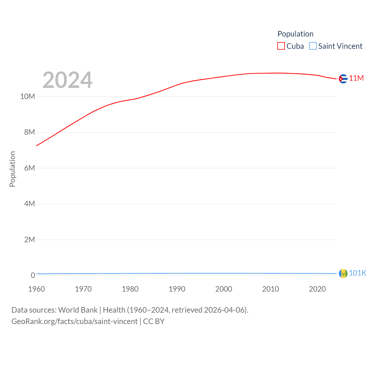 Cuba has a population of 11M (ranked 87/197), compared with 101K in Saint Vincent (ranked 184/197). Cuba's land area is 40,077 sq mi versus 150.6 sq mi for Saint Vincent (ranked 103rd vs. 185th).